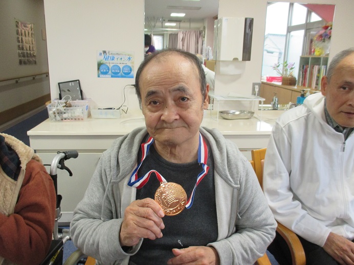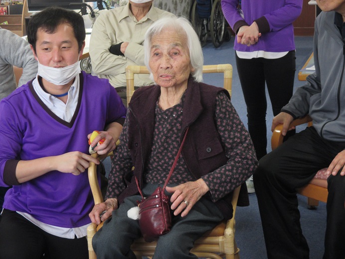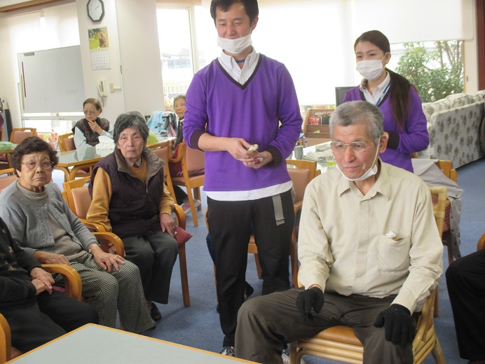 送迎車を待っている間、スタッフと一緒に手のリハビリになるゲームに挑戦しました\(^_^)/