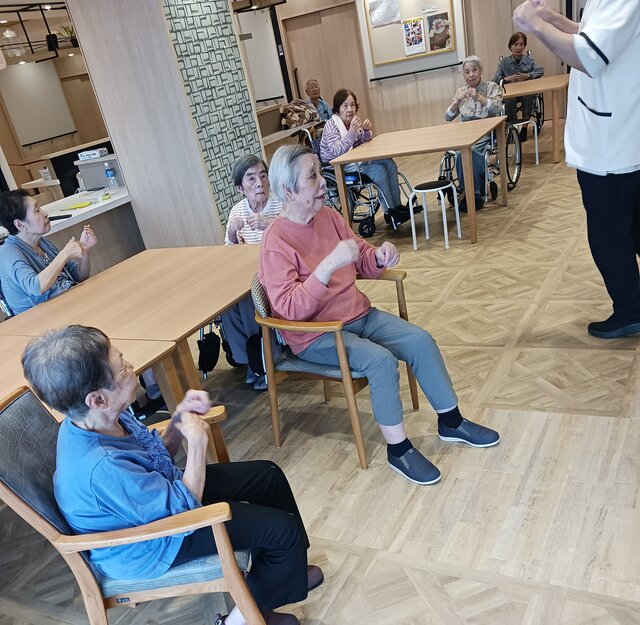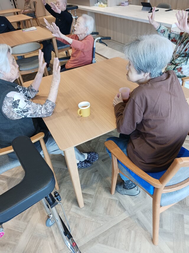 「い~~ち、に~~い、さ~~ん」「もしもしカメよ~、カメさんよー」「うさーぎーお~~いし、かのやま~~」と今日は歌に合わせて動くプログラムでしたが、皆さんご自身のペースでしっかりと体操されていましたよ。