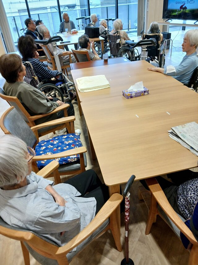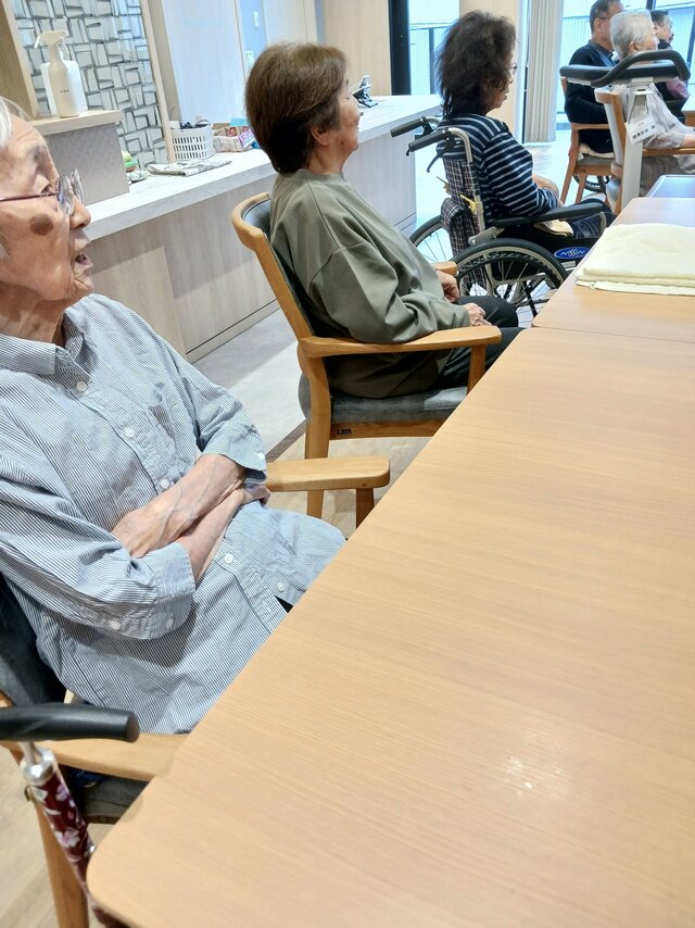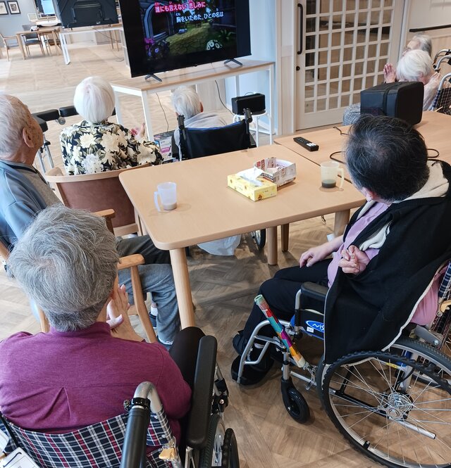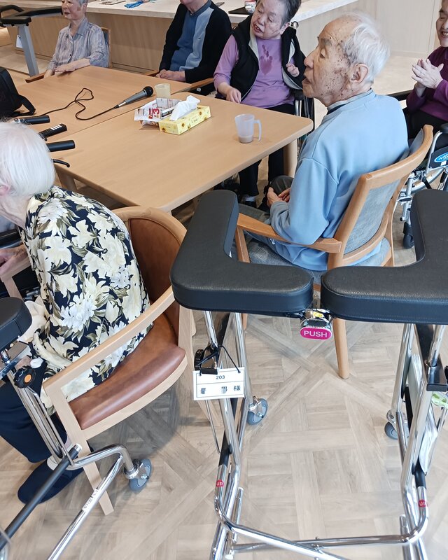 今日は、ショートステイご利用の方々とも合同で実施しましたのでいつもより大人数での開催となりましたが、マイクを奪い合うこともなく終始笑顔で和やかな雰囲気のまま実施できたようです。