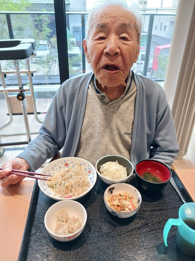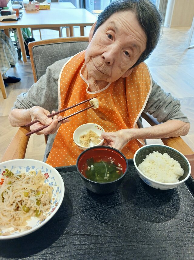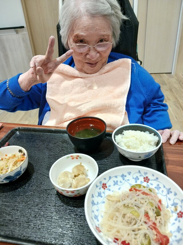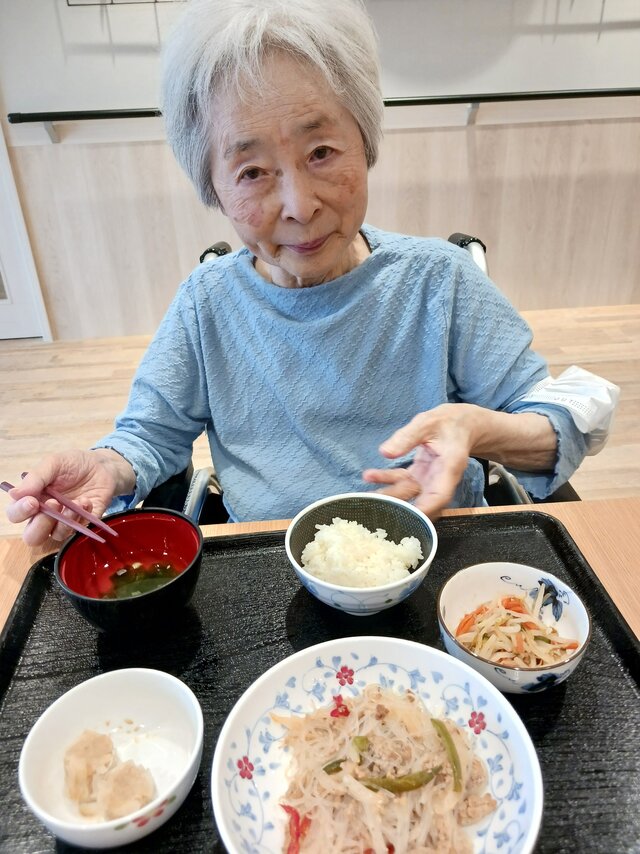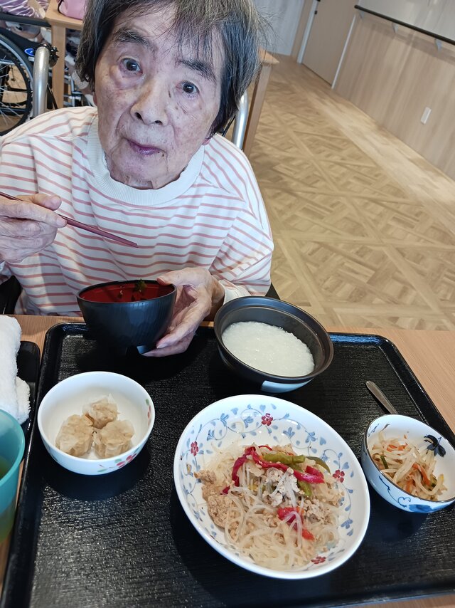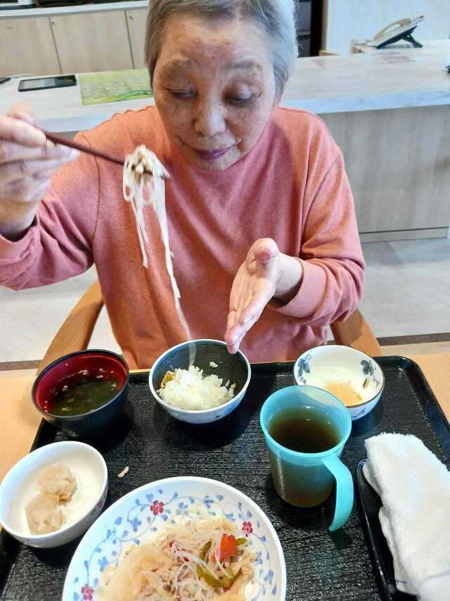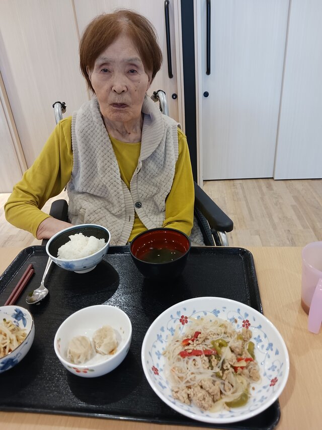 「今日のメニューは中華やね~、シュウマイもあるし」「チャプチェってなんやの?どうやってつくるんやろね」「美味しくいただいていますよ~」目の前に届けられたメニューを確認して、ひと品ひと品をしっかりと召し上がっておられましたよ。