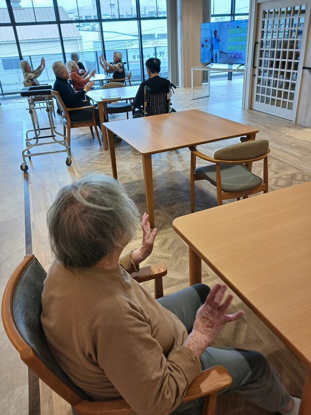 普段の様子ではございますが、午前中に行っています健康体操(YouTubeを使って行いますのでプログラムはランダムです)の様子をご紹介させていただきます