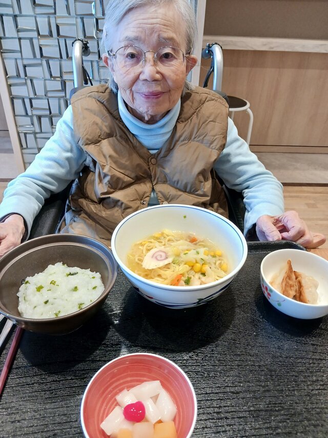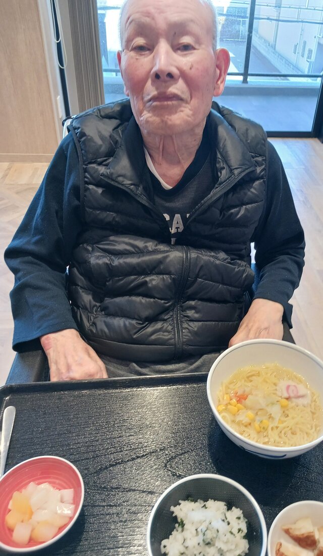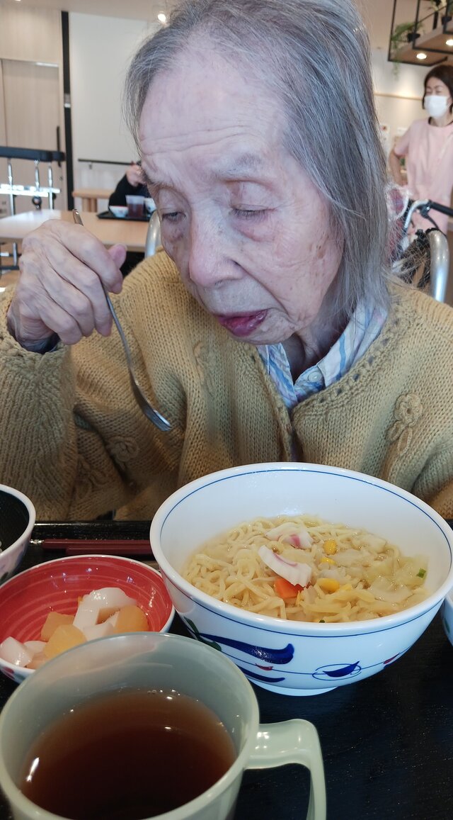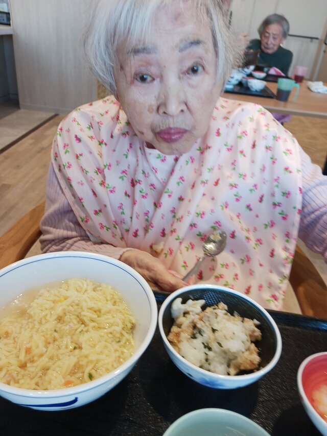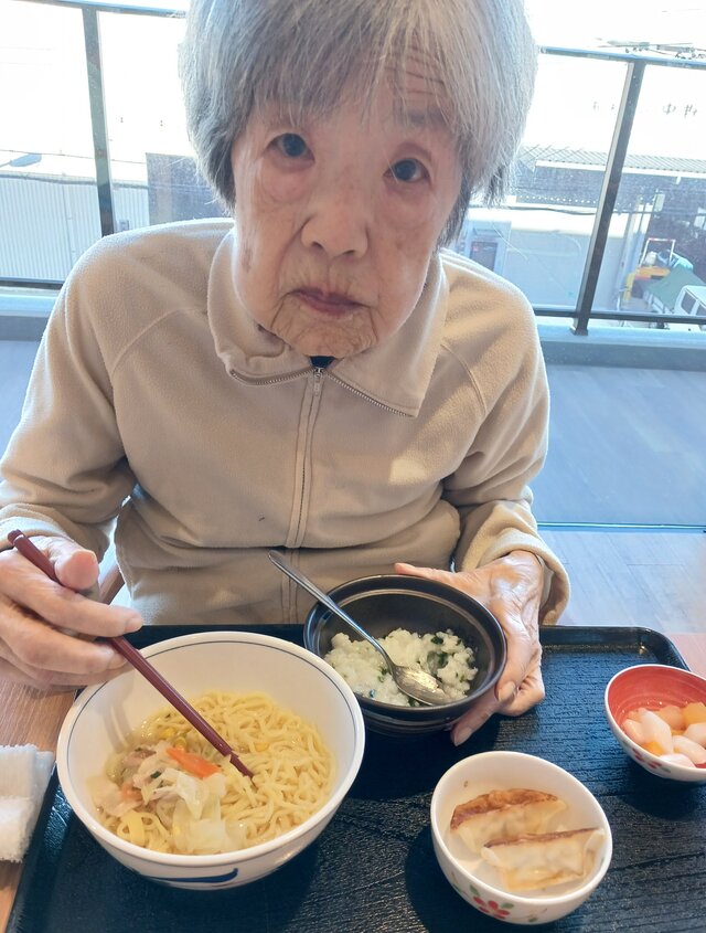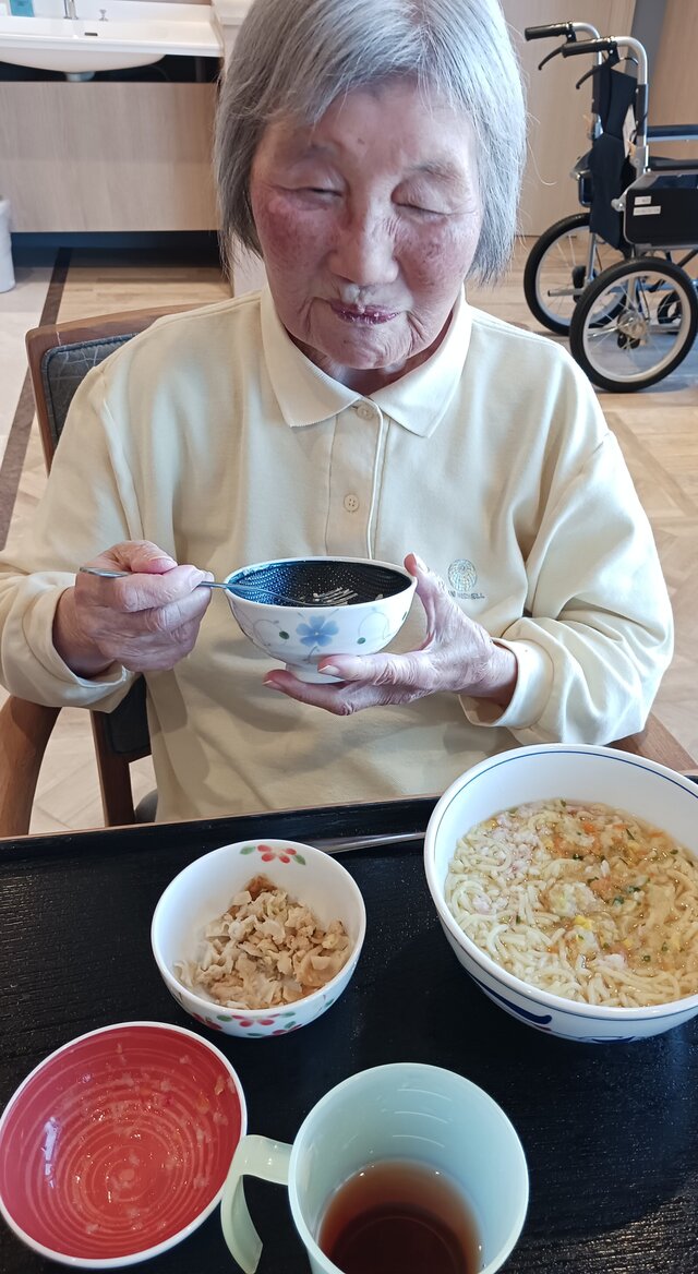 「美味しいかって?もちろん、いつも美味しいわよ~」「ラーメンに餃子って...サラリーマンの定食みたいやなぁ(笑)」「たまには麺も美味しいわね。子供が好きで良く作ってたのよ~」と皆さま今日のメニューについて色々なお話をされながら、楽しそうに召し上がっておられましたよ。