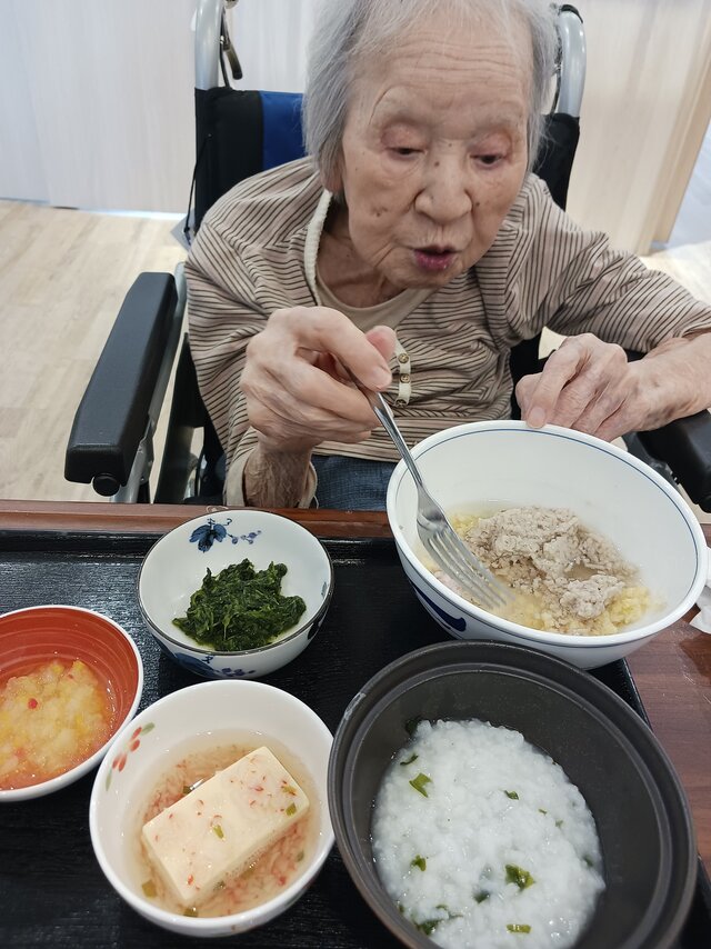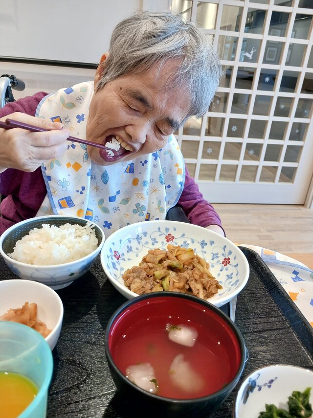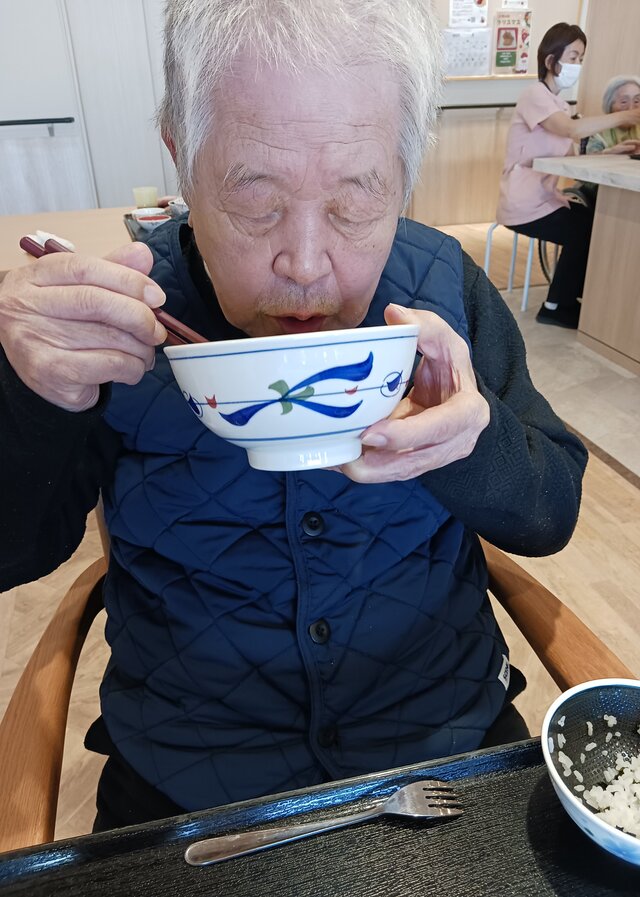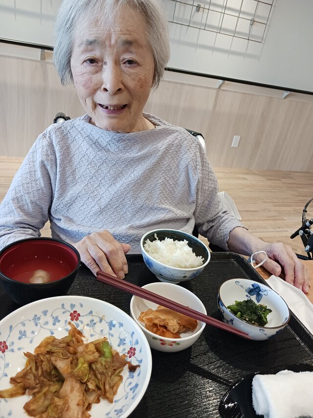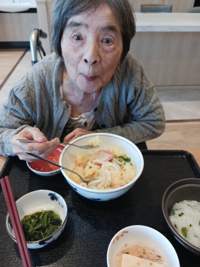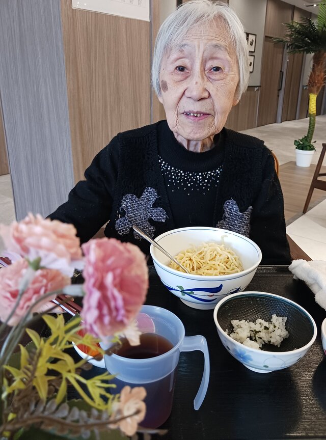 「美味しいかって?もちろん、いつも美味しいわよ~」「ラーメンに餃子って...サラリーマンの定食みたいやなぁ(笑)」「たまには麺も美味しいわね。子供が好きで良く作ってたのよ~」と皆さま今日のメニューについて色々なお話をされながら、楽しそうに召し上がっておられましたよ。