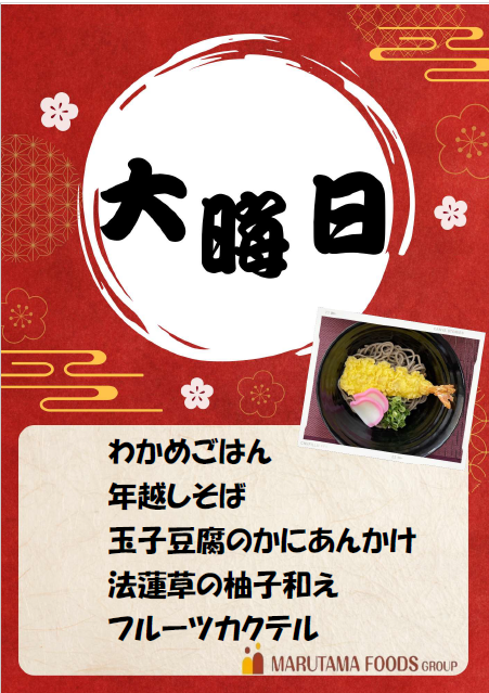 大晦日当日のお昼のメニューは、年越しそば・わかめごはん・玉子豆腐の蟹餡かけ・法蓮草の柚子和え・フルーツカクテルとなっております。