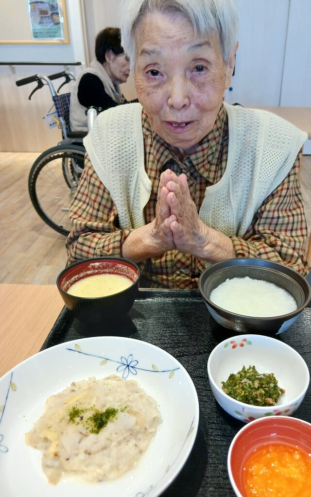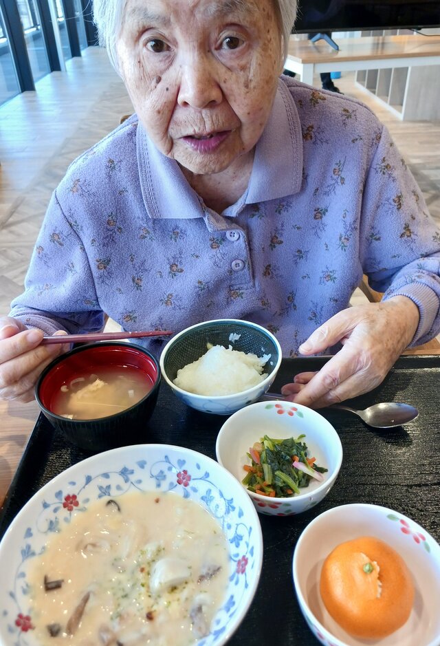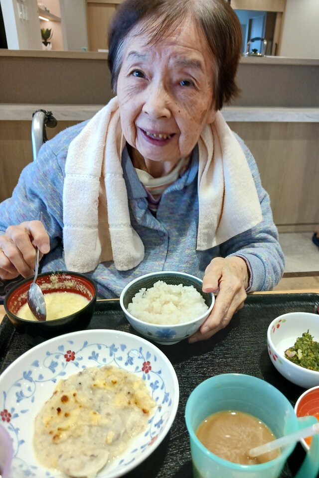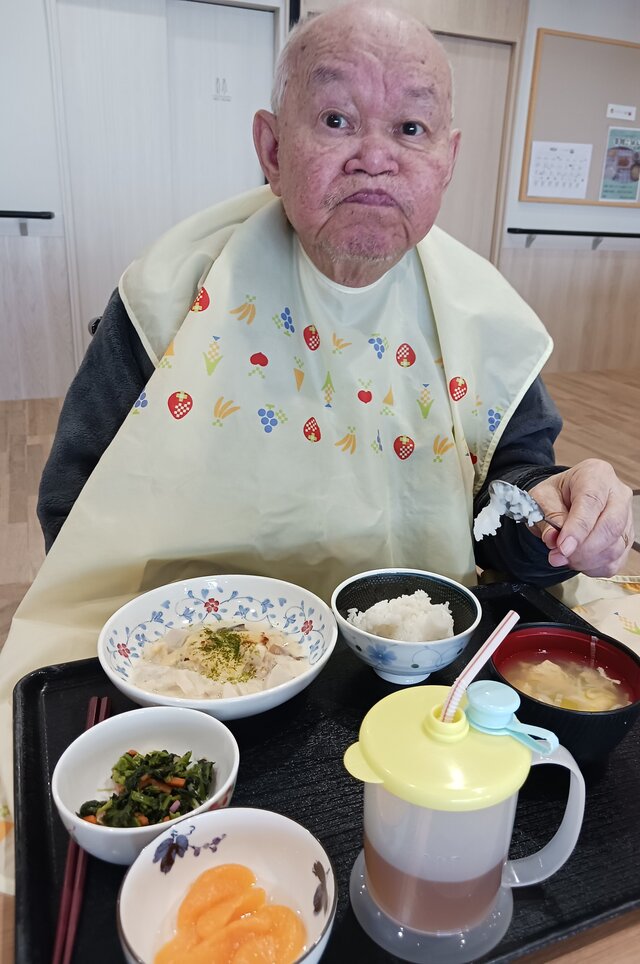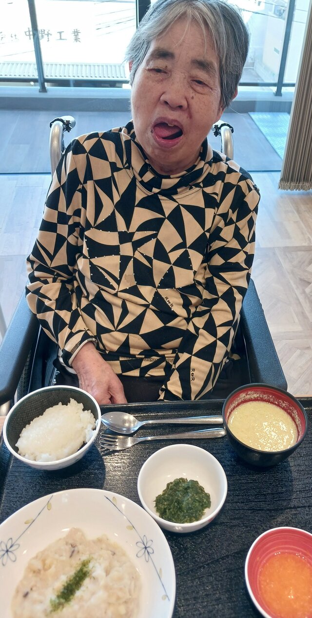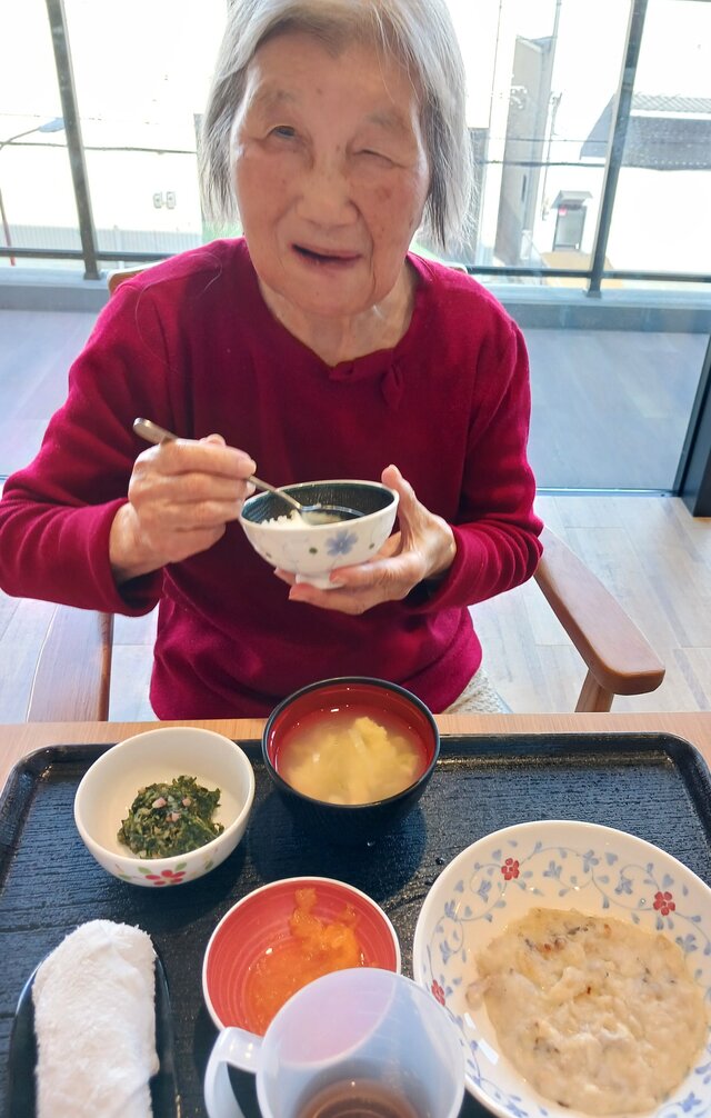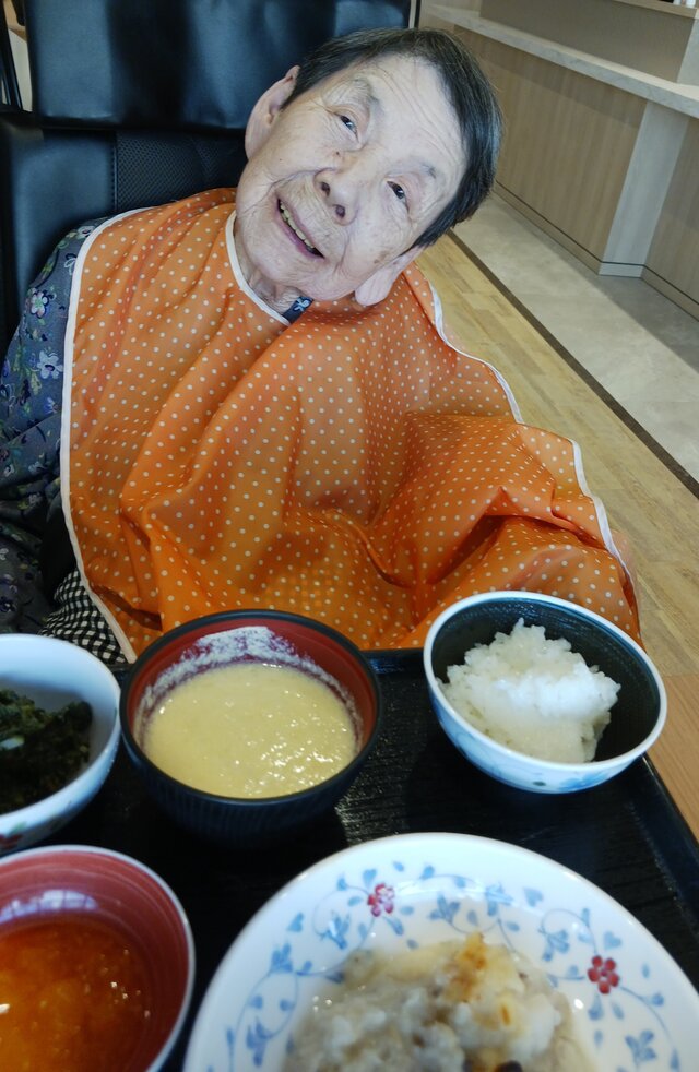 「いつもありがとうね~、いただきま~~す。」と、いつも元気な入居者の皆さま。「ここのご飯は美味しいねんで~~、あんたも食べ~」と、いつも優しい皆さま。「これ見てや~、大きな茶碗やろ!こんなに食べれへんで~」と言いながら、全部きれいに完食される皆さま。