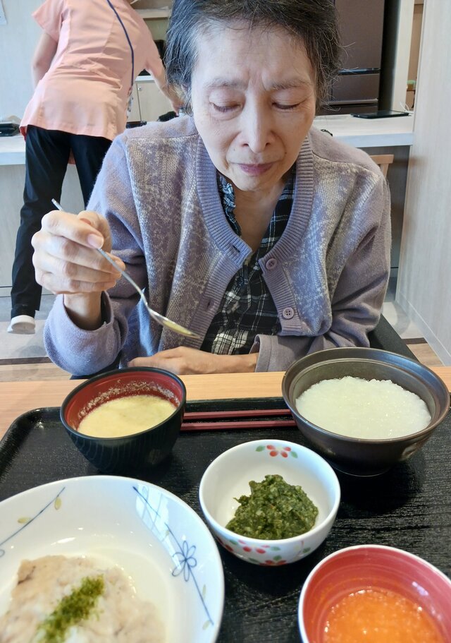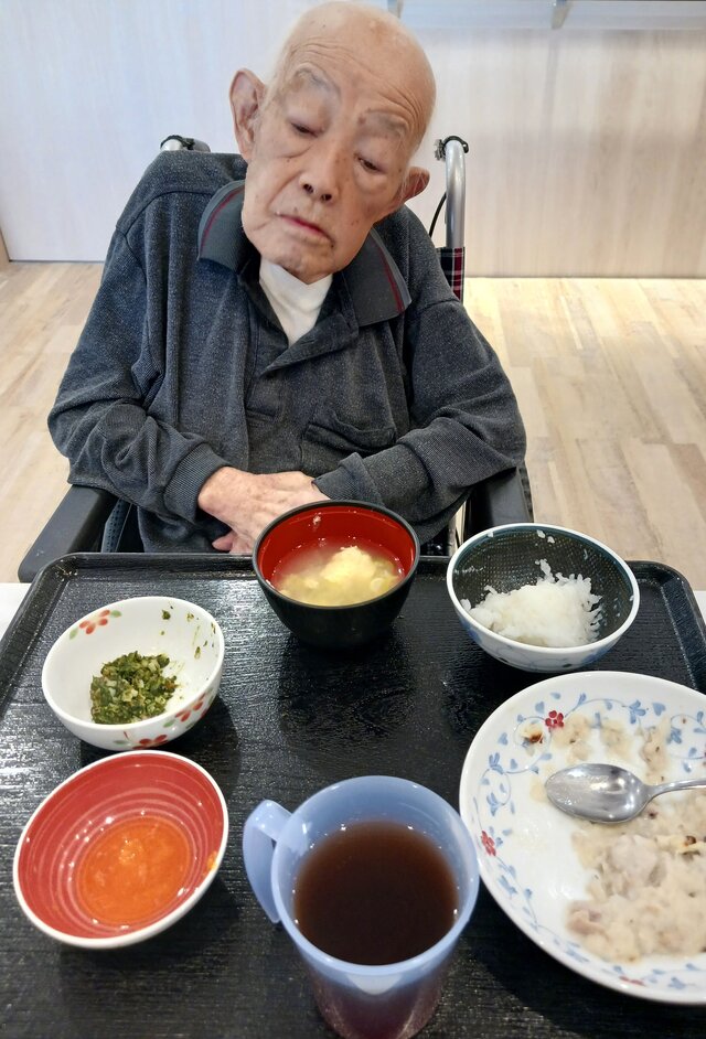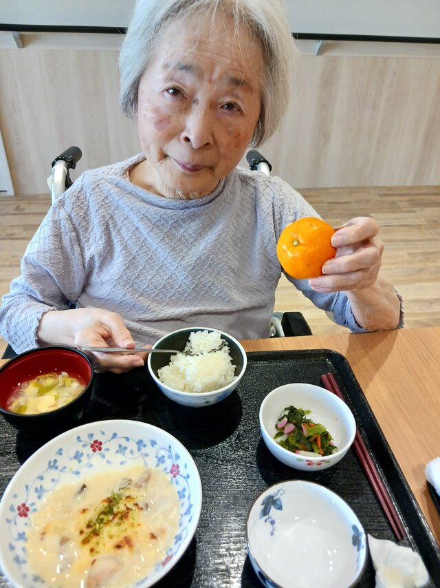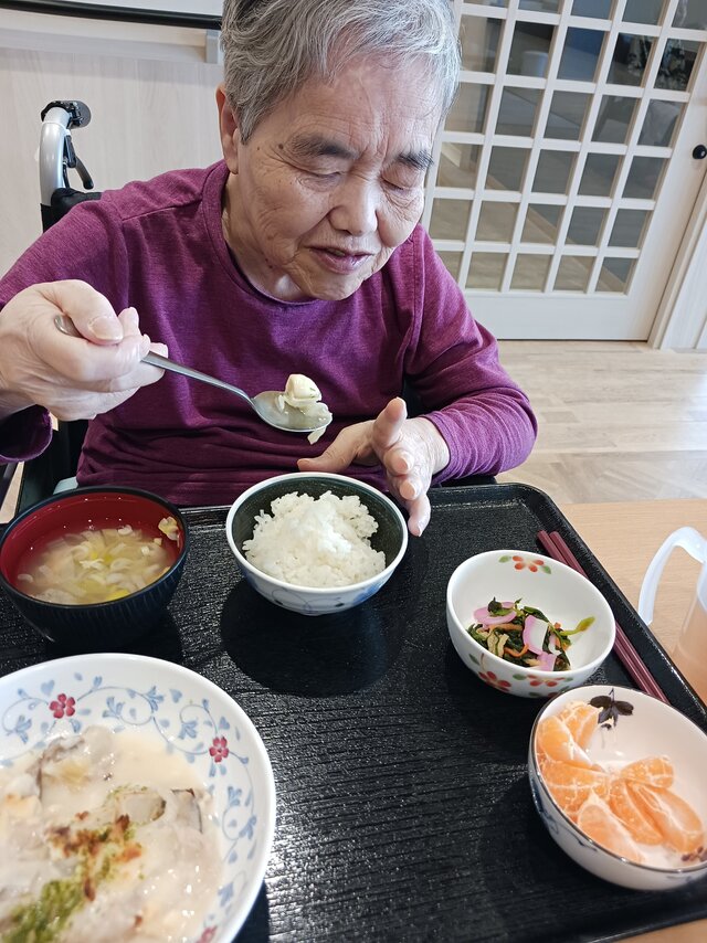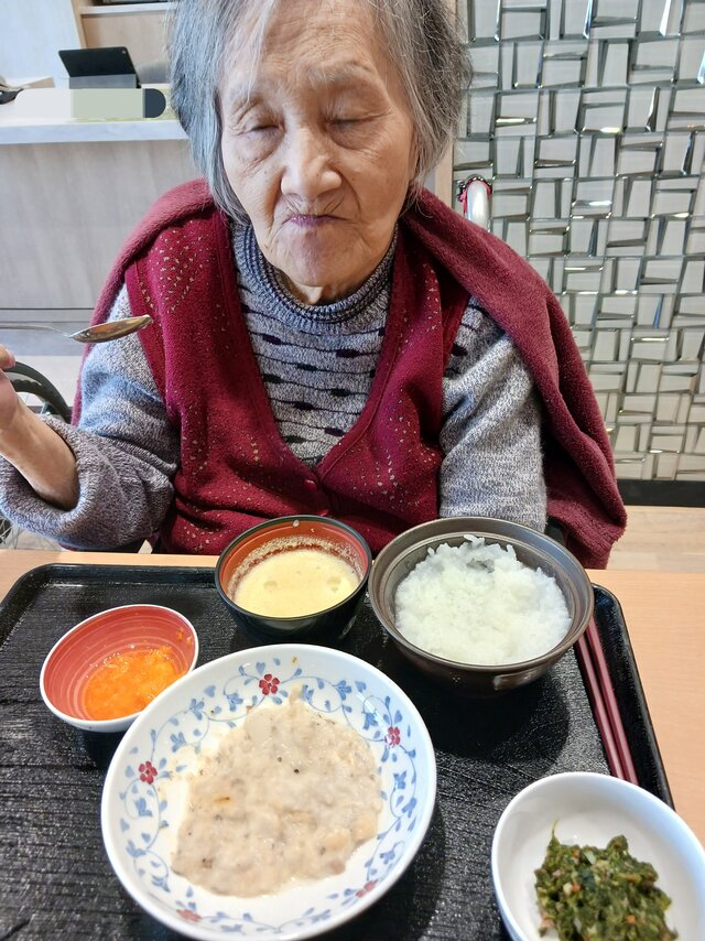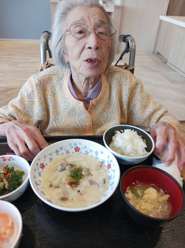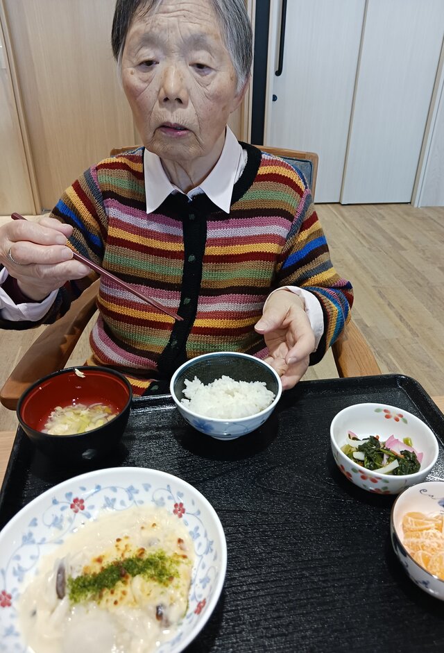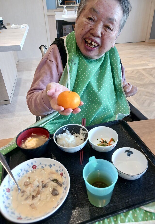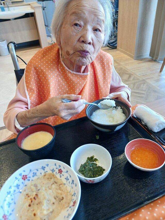「いつもありがとうね~、いただきま~~す。」と、いつも元気な入居者の皆さま。「ここのご飯は美味しいねんで~~、あんたも食べ~」と、いつも優しい皆さま。「これ見てや~、大きな茶碗やろ!こんなに食べれへんで~」と言いながら、全部きれいに完食される皆さま。