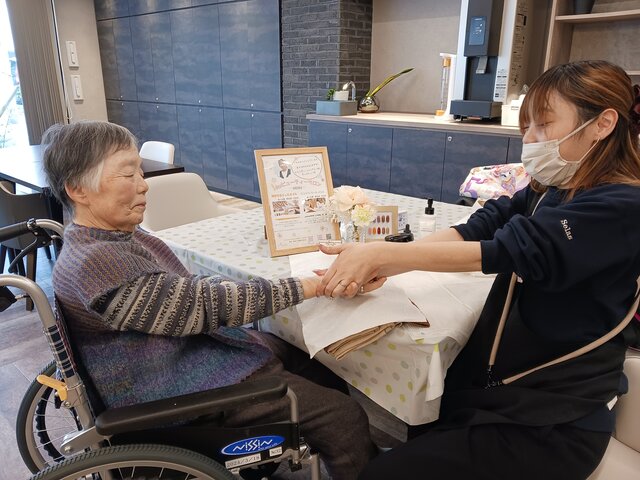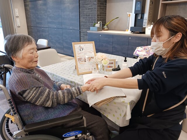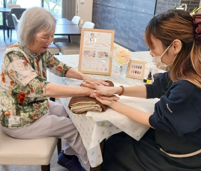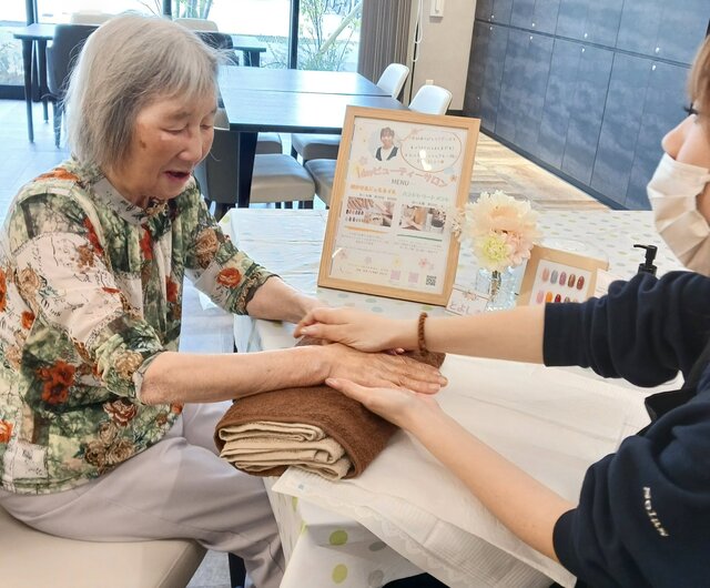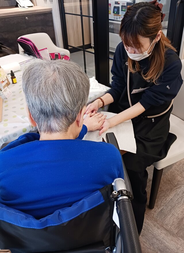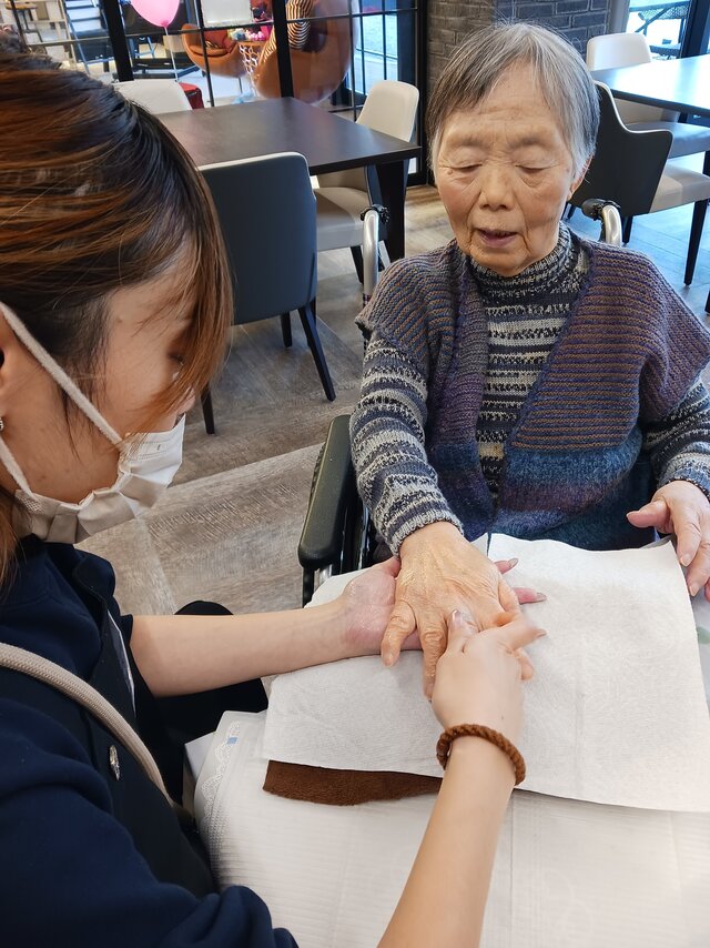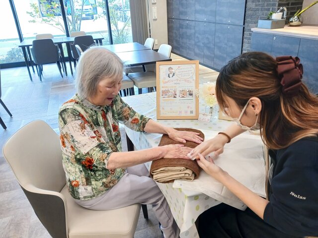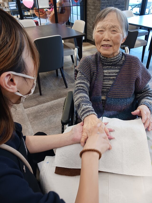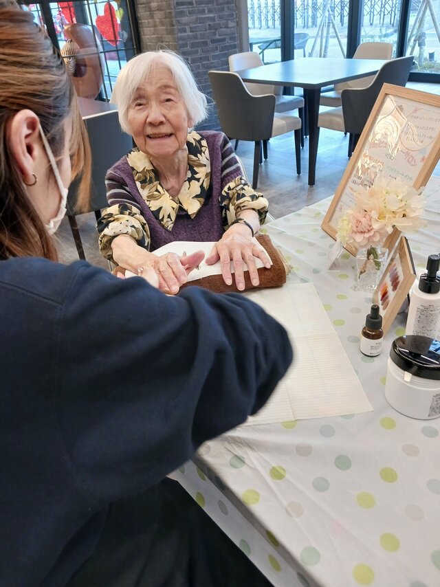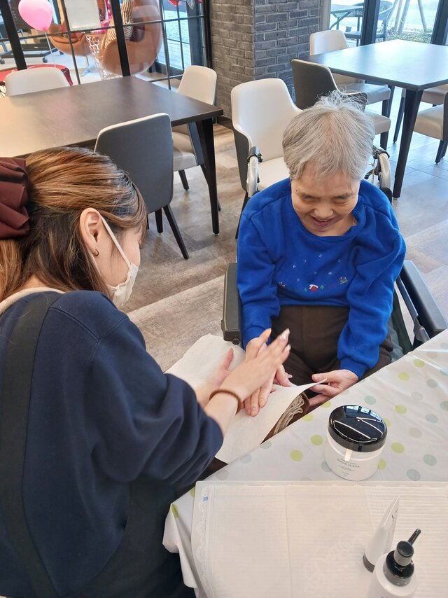 「今日は何かエエことしてくれるって聞いてきたんやけど、何してくれるんかなぁ」「ココは、凄く良い匂いしてるね~~。デパートみたいやわぁ」と普段お過ごしのフロアとは違う雰囲気に大変喜ばれていたみたいですよ。施術の仕上がりにも大満足のご様子でした。