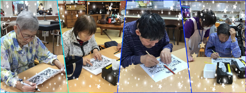 間違い探しが済んだら、モノクロの間違い探しのプリントを塗り絵にされたり、各々で楽しんでいらっしゃいます(^_-)-☆