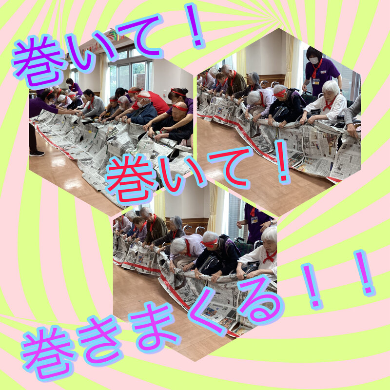 ・巨大新聞紙をチーム一体となって早く巻いた方が勝ち!!
