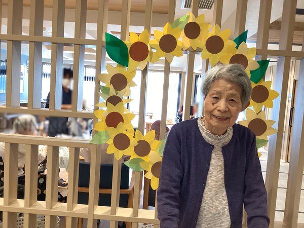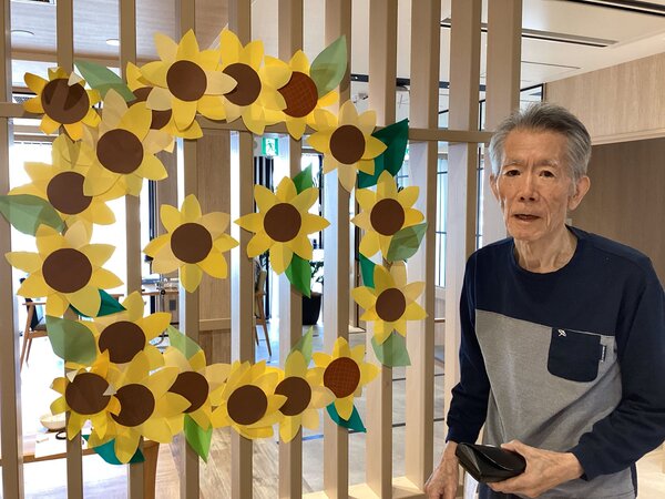 今回は先日ご入居者の皆さまと「ひまわり」を作って各階に飾り付けしたときの