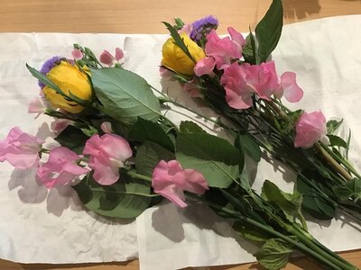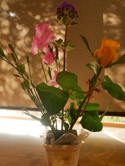 今月のお花は、バラ、アゲラタム、スイートピー、ソネットカーネーション。