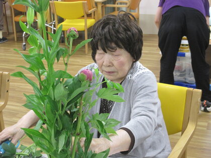 今回の生け花は座っているご入所者よりも大きなひまわりが目立ちますねー!