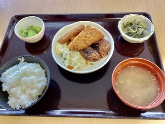 今回のメニューではフライ盛り合わせ、うまい菜のさっと煮、漬物、豚汁となっております。