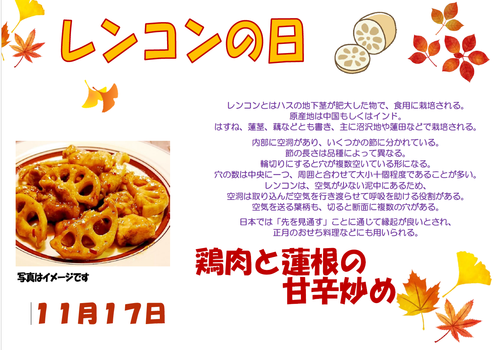 明日は、「レンコンの日」ということで、鶏肉と蓮根の甘辛炒めが昼食に提供させていただきます。