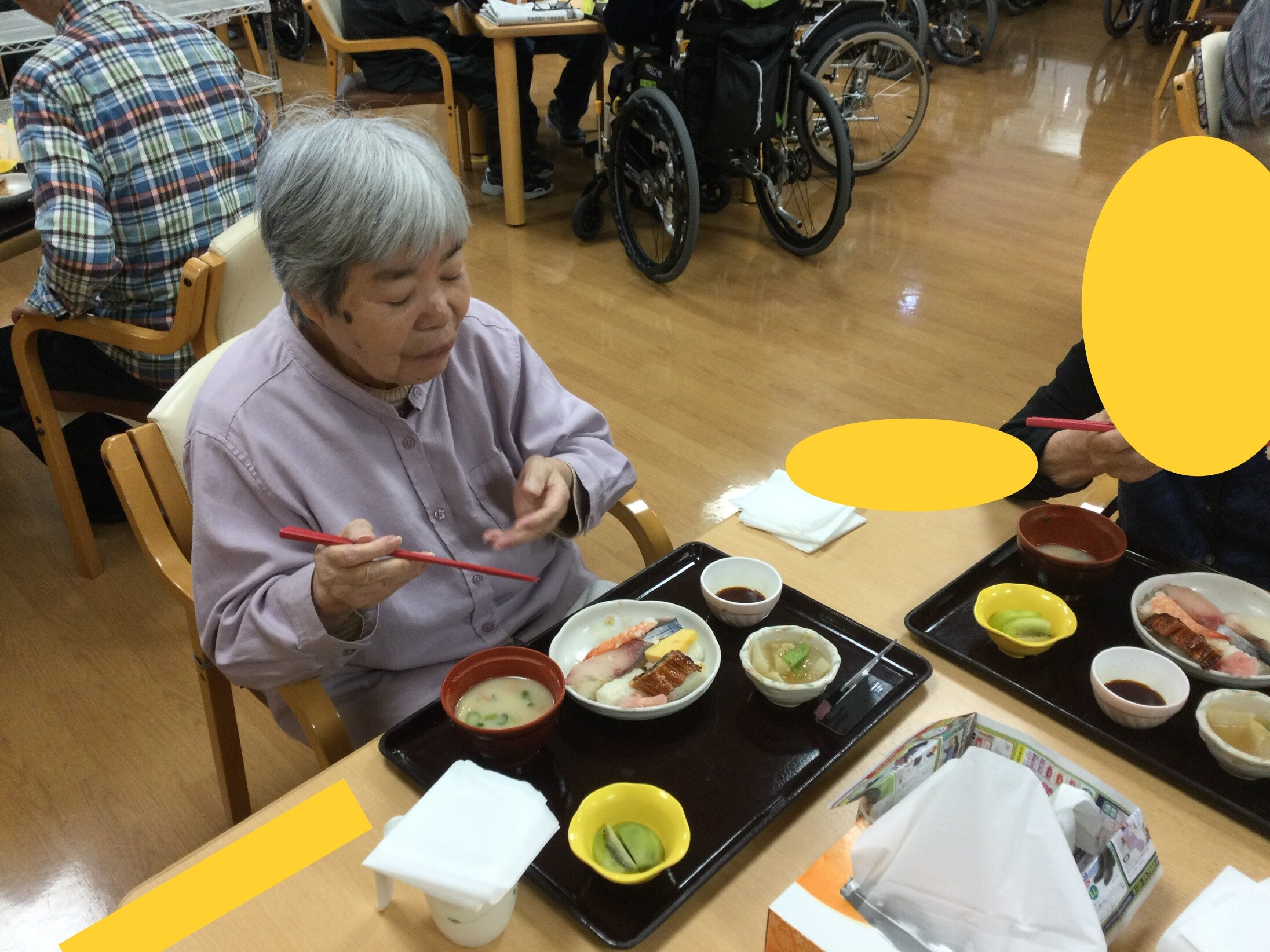 「今日のメニューは変わっているから良かったわー。」「お寿司好きやから最高ですねっ。」「美味しかったねっ。ありがとう!」との感想を色々頂き、たいへん満足されたようです