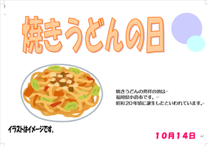 以降、町おこし活動を行っている「小倉焼きうどん研究所」がこの日を「焼きうどんの日」と制定したそうです。