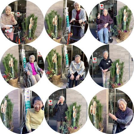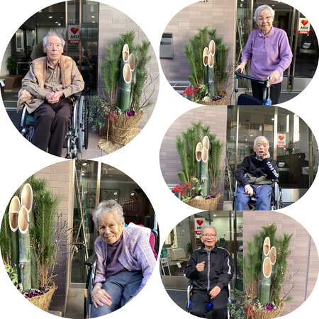 さてお正月という事で、ご入居者様と玄関の門松で写真撮影、