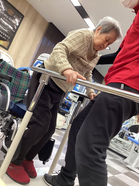 骨折直後は平行棒内での起立・立位は難しく、全介助で立位を取っていました。徐々に足の筋力が強くなり、現在は20秒ほどは保持ができるようになられました。