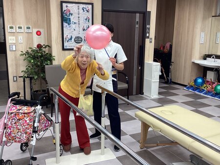 ご入居者様の体調を見ながら、楽しくかつ真剣に取り組めるようなリハビリをさせていただいております。