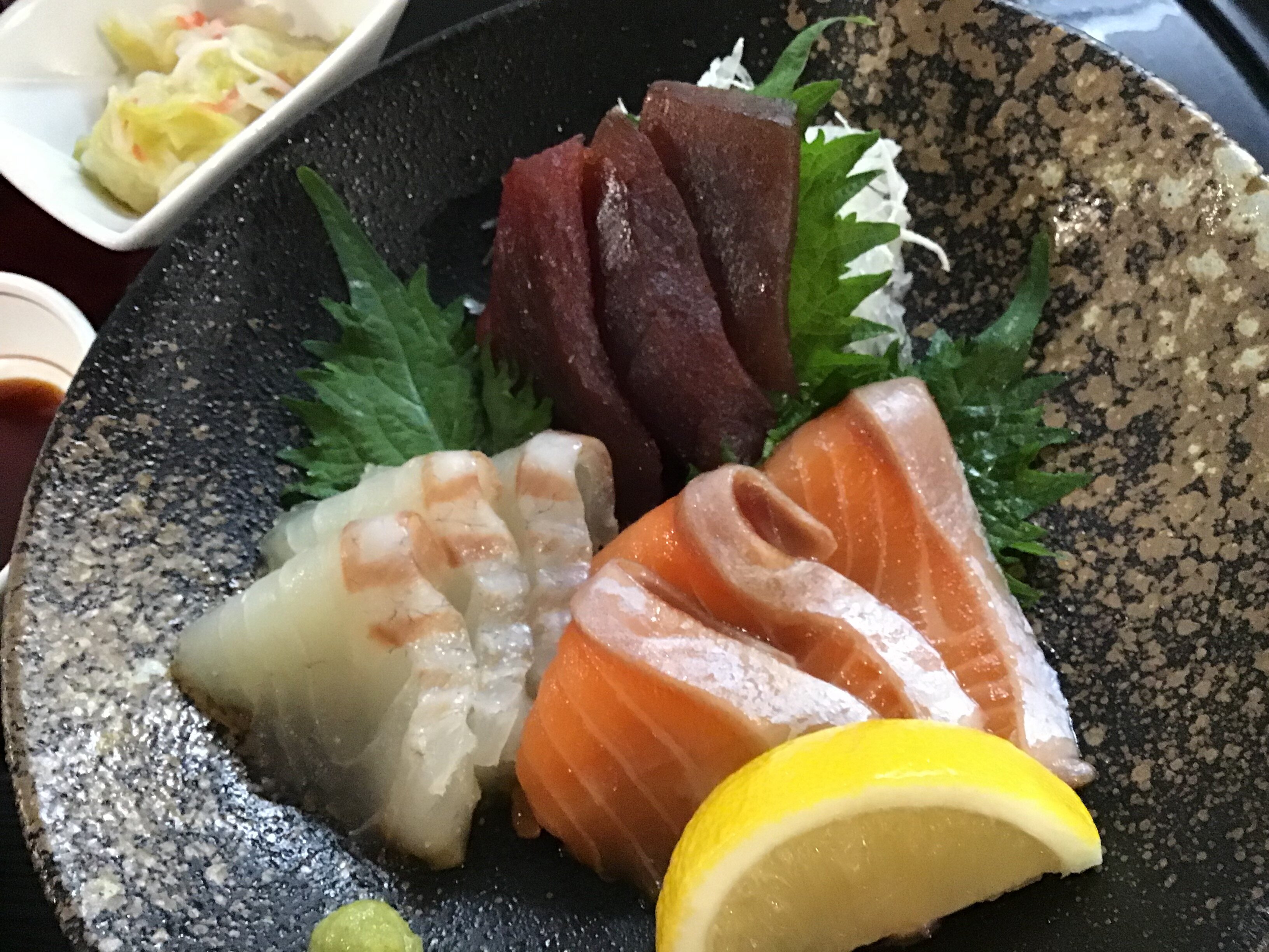 今日の大目玉は何と言っても、艶やかなお刺身です! マグロの赤、サーモンのオレンジ、タイの白にシソの緑が映えて、見た目から食欲をそそります。