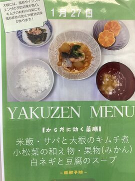 本日は、体に効く薬膳料理としまして1/27(火)の昼食の薬膳メニューをお知らせいたします。