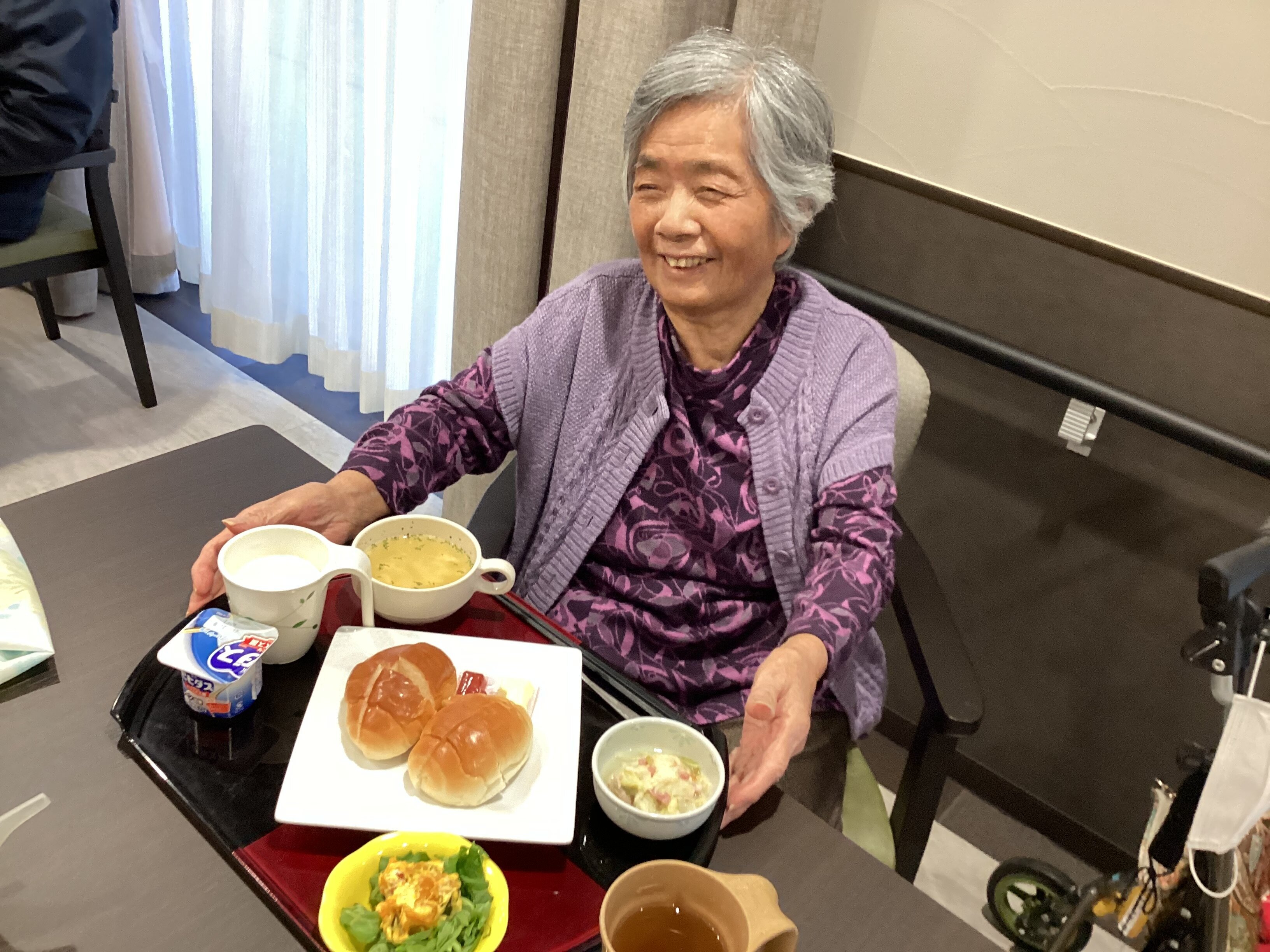 本日の朝食はつやつやのロールパン(^^♪ 「パンのいい香りがするわ」と入居者様も配膳の時から楽しみにされていました!! ヨーグルトやサラダ、温かいスープを添えた見た目にも鮮やかなお食事です。