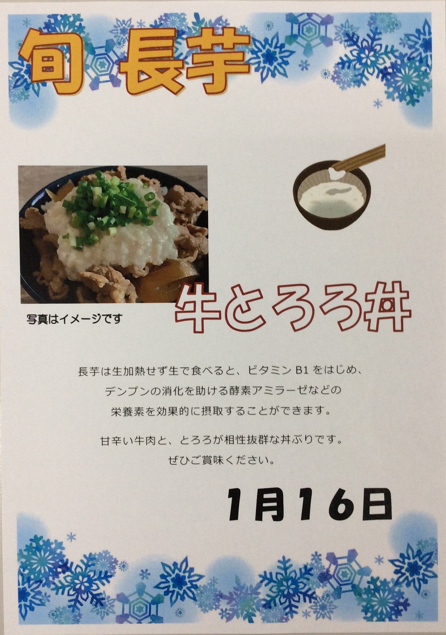 1/16は、旬の長芋を使った『牛とろろ丼』です。