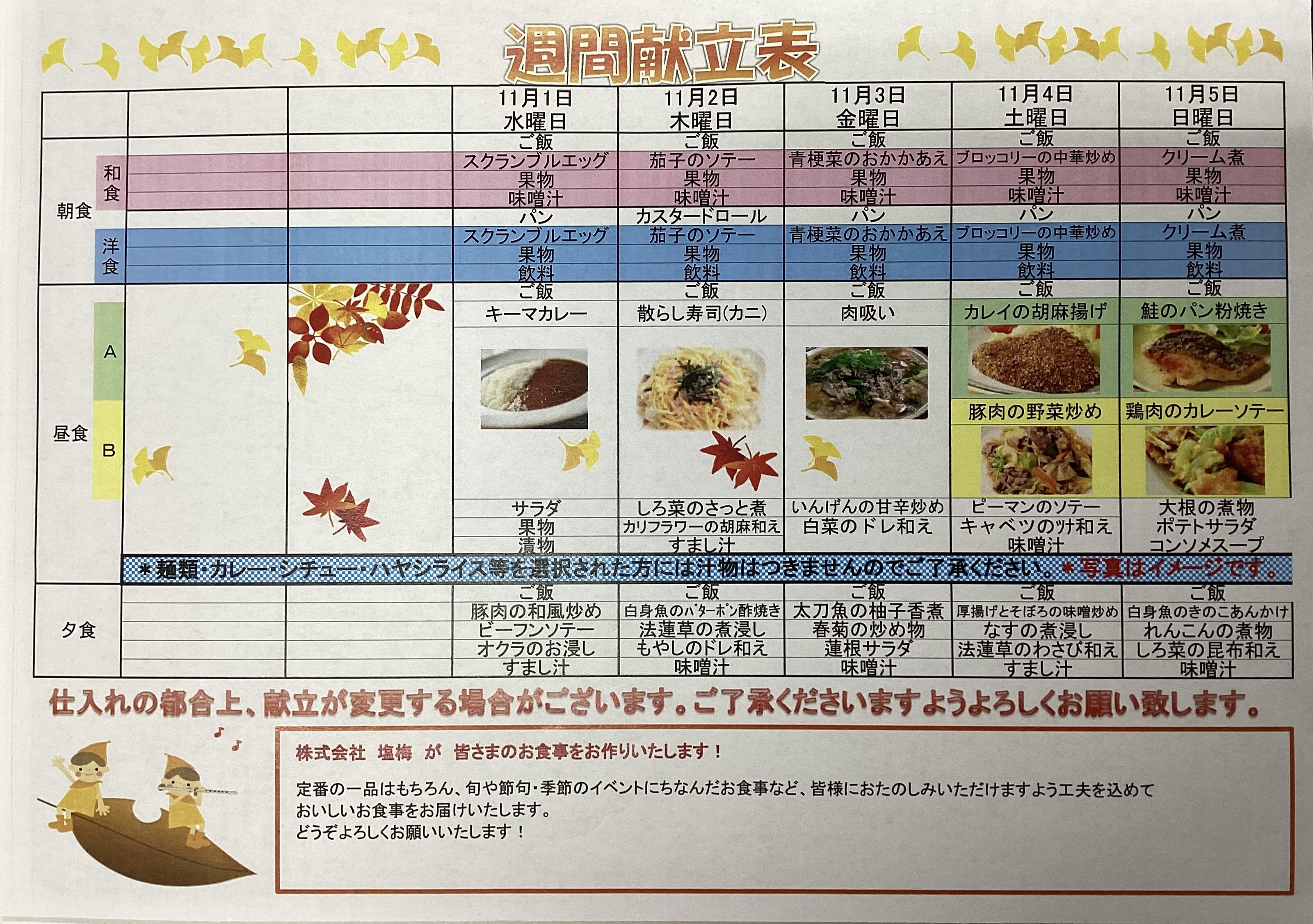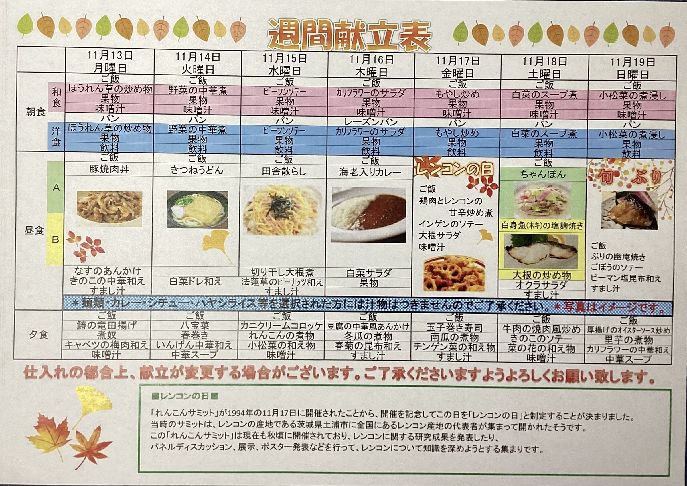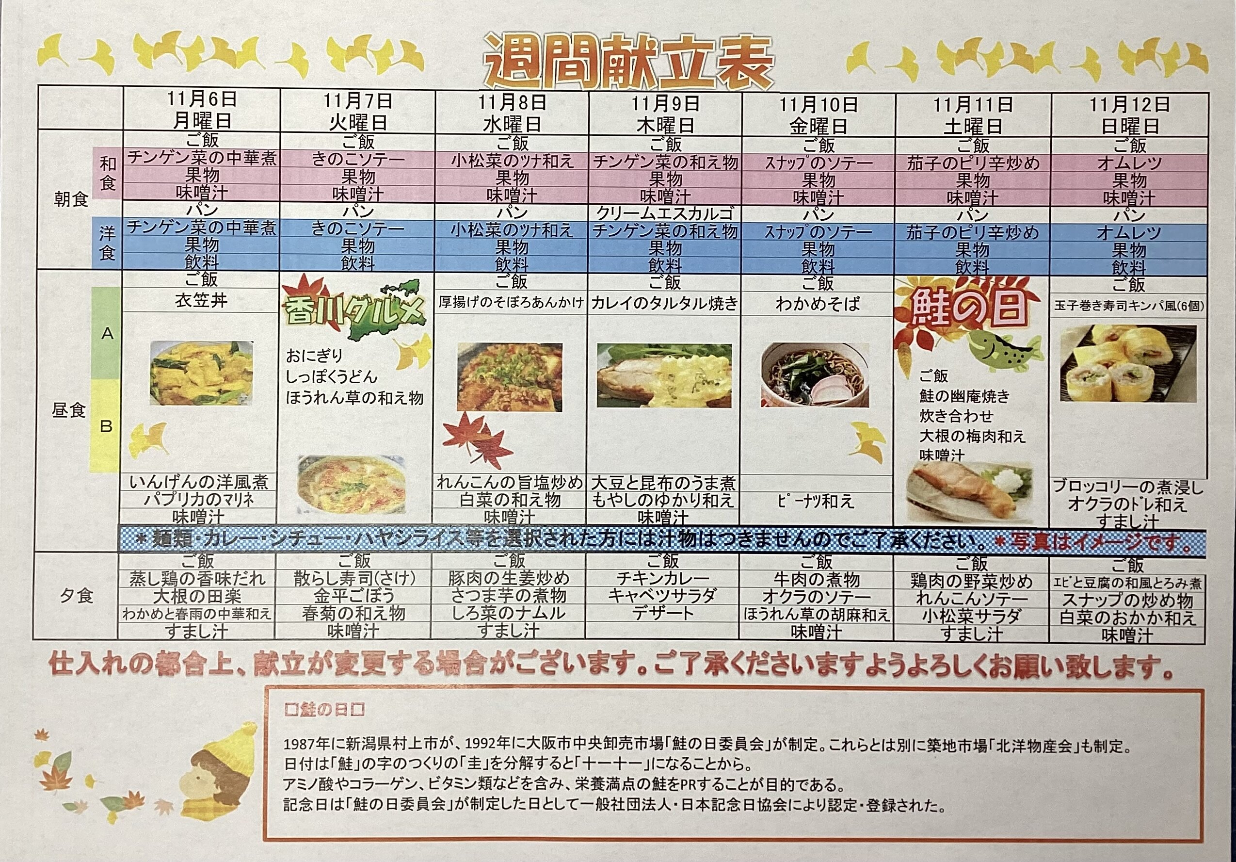 本日は、11/6~11/12の献立表をご紹介いたします。