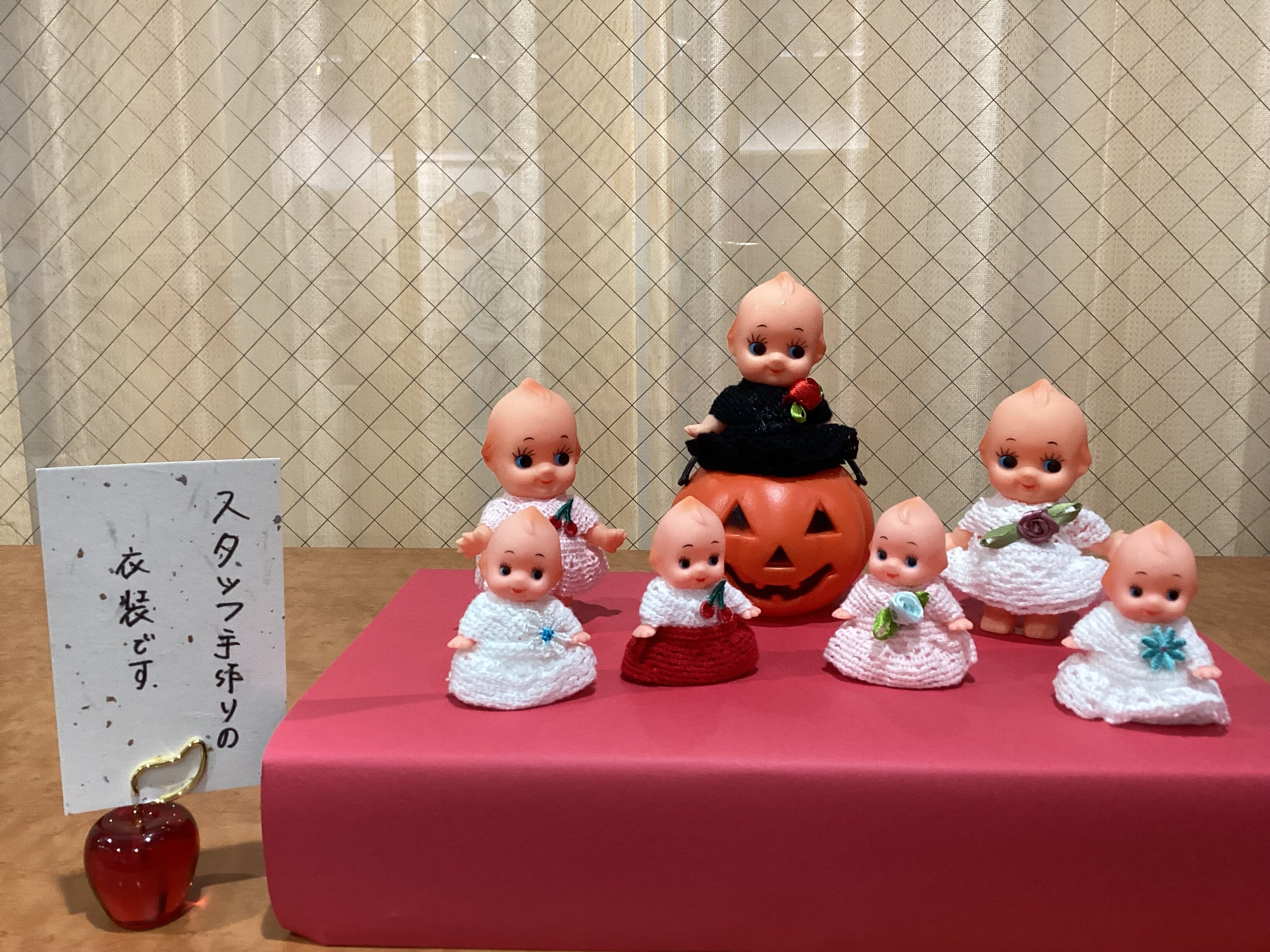 職員手作りの衣装を着た、キューピーちゃんが玄関でお出迎えしています。