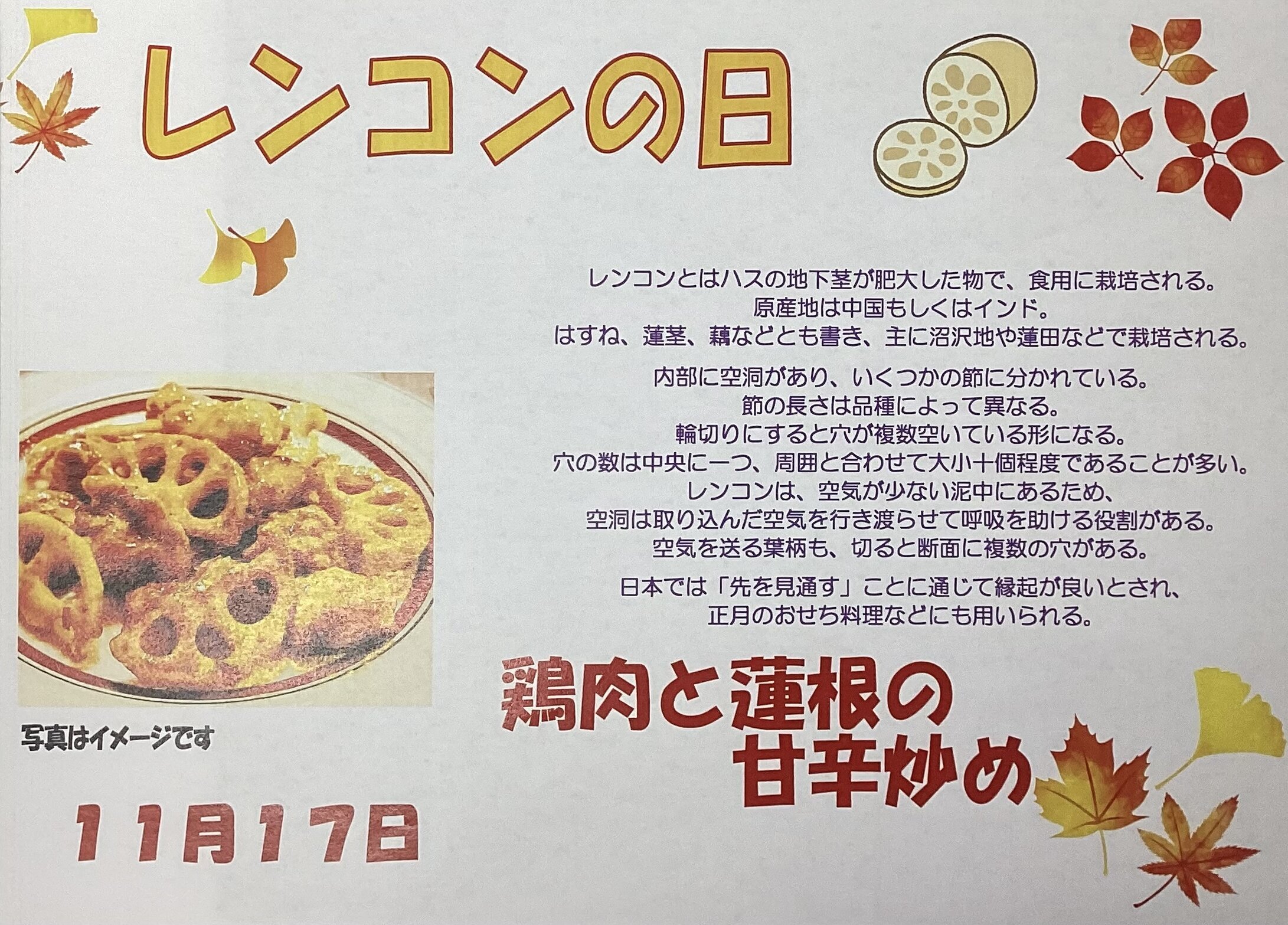 11/17㈮は、レンコンの日『鶏肉とレンコンの甘辛炒め煮』です。