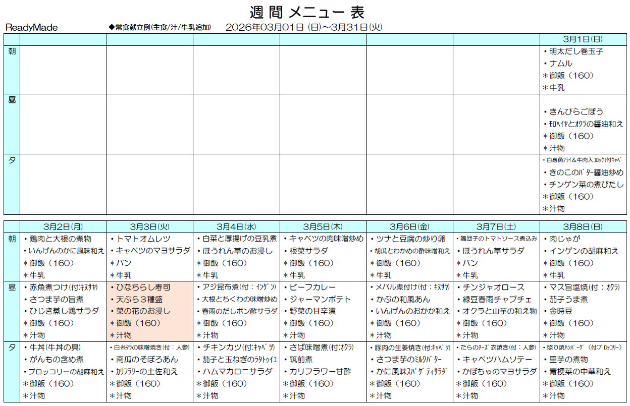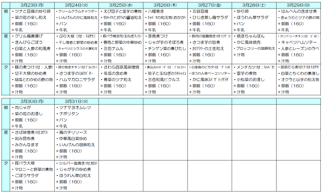 ※朝食にはご飯かパン、昼夕食にはご飯とみそ汁が付きます。