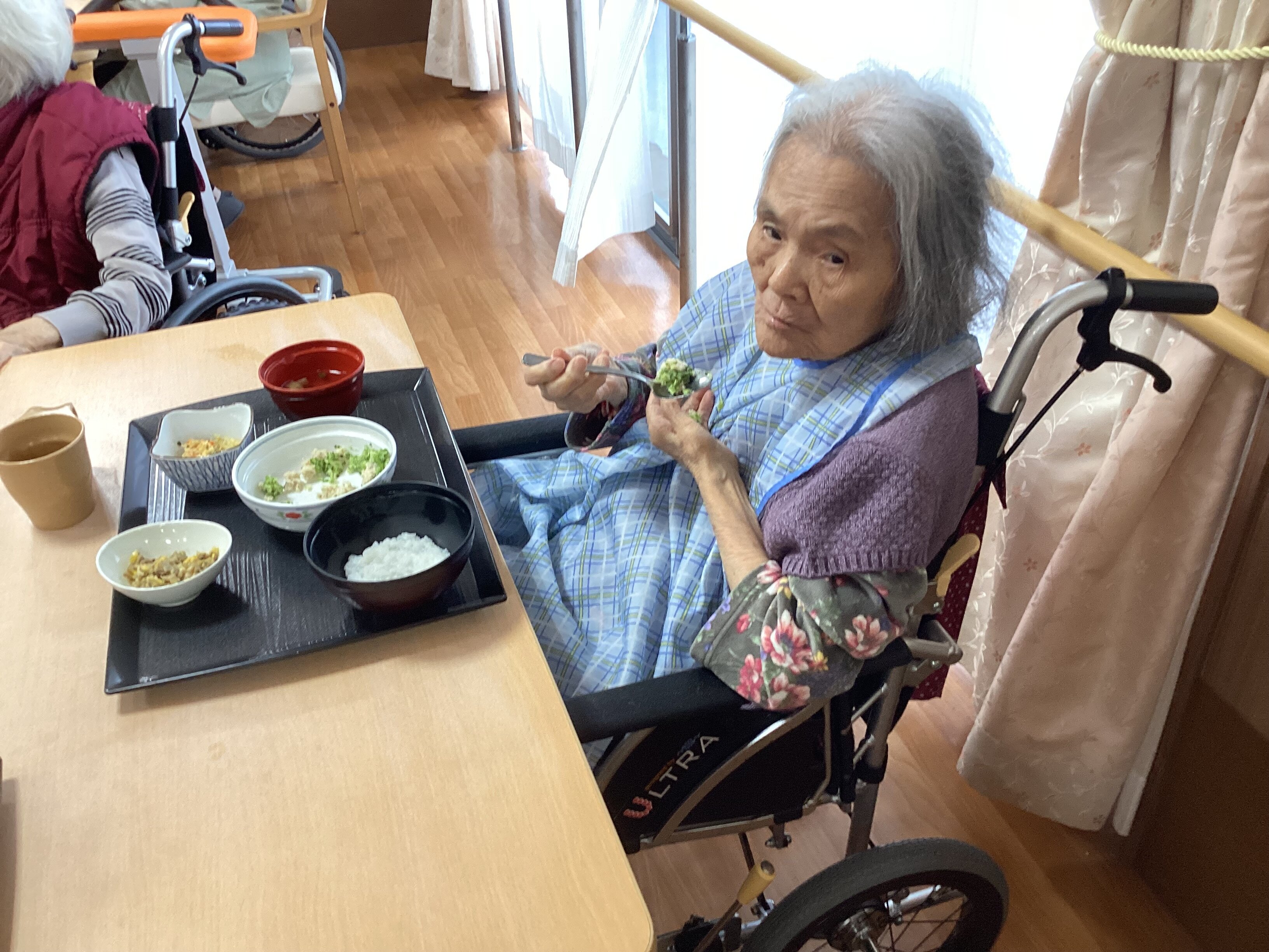 ご自身で食事が困難な時は職員がお手伝いしています。