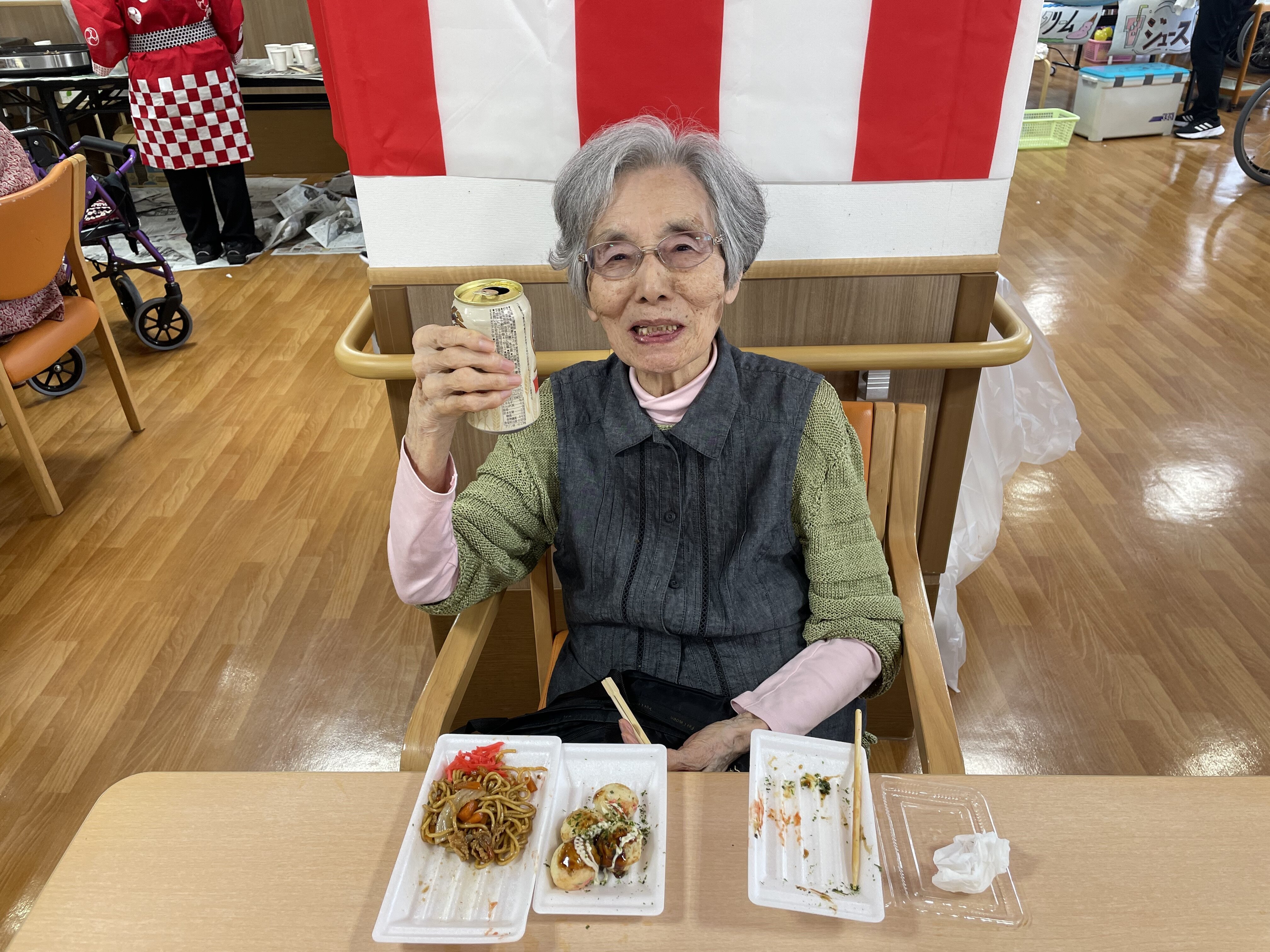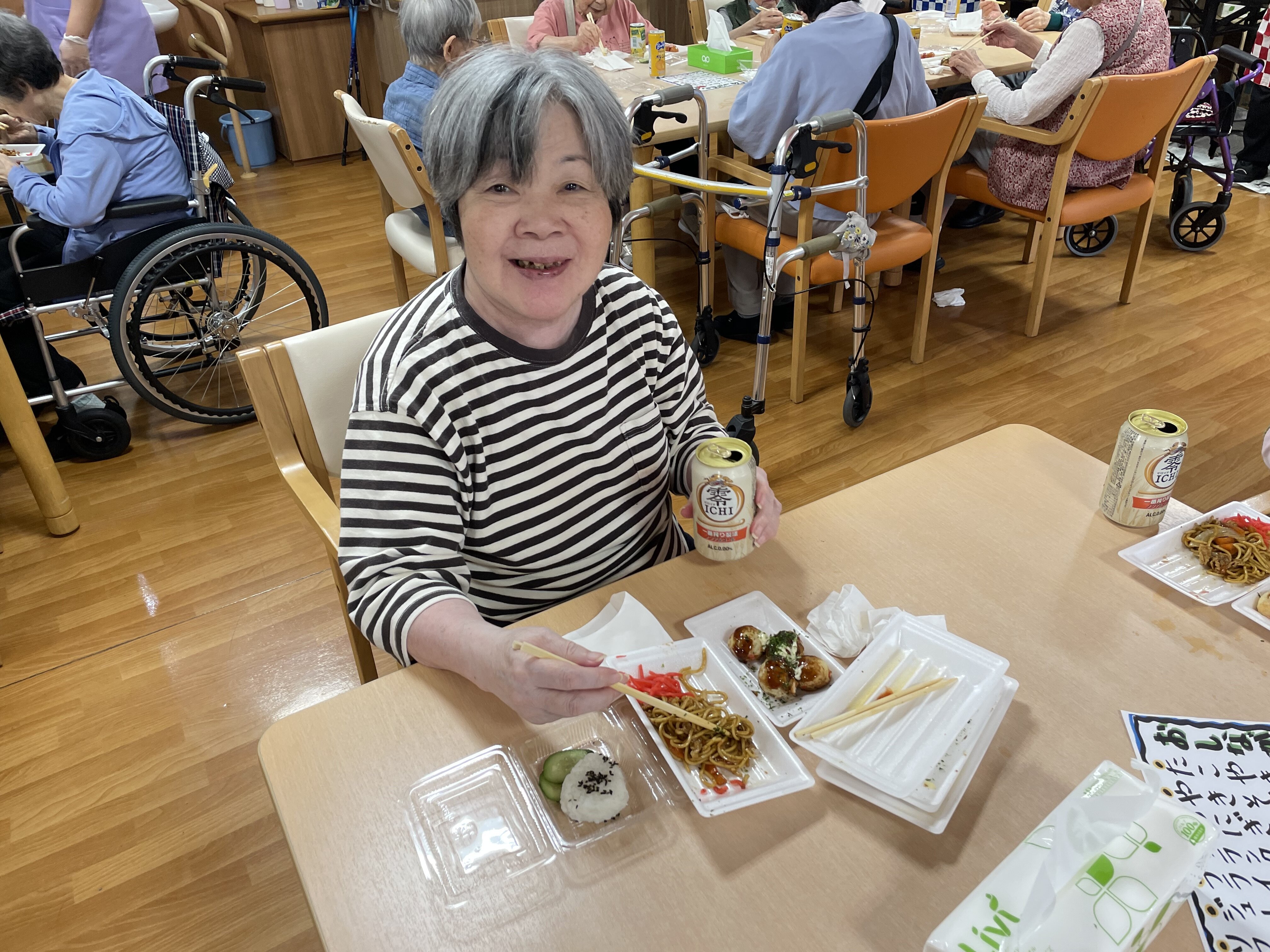 昼食はお祭りメニュー♩ジュースに懐かしいラムネや、ビール(ノンアルコール)をご提供♩ ビールが1番人気でした(^_^)
