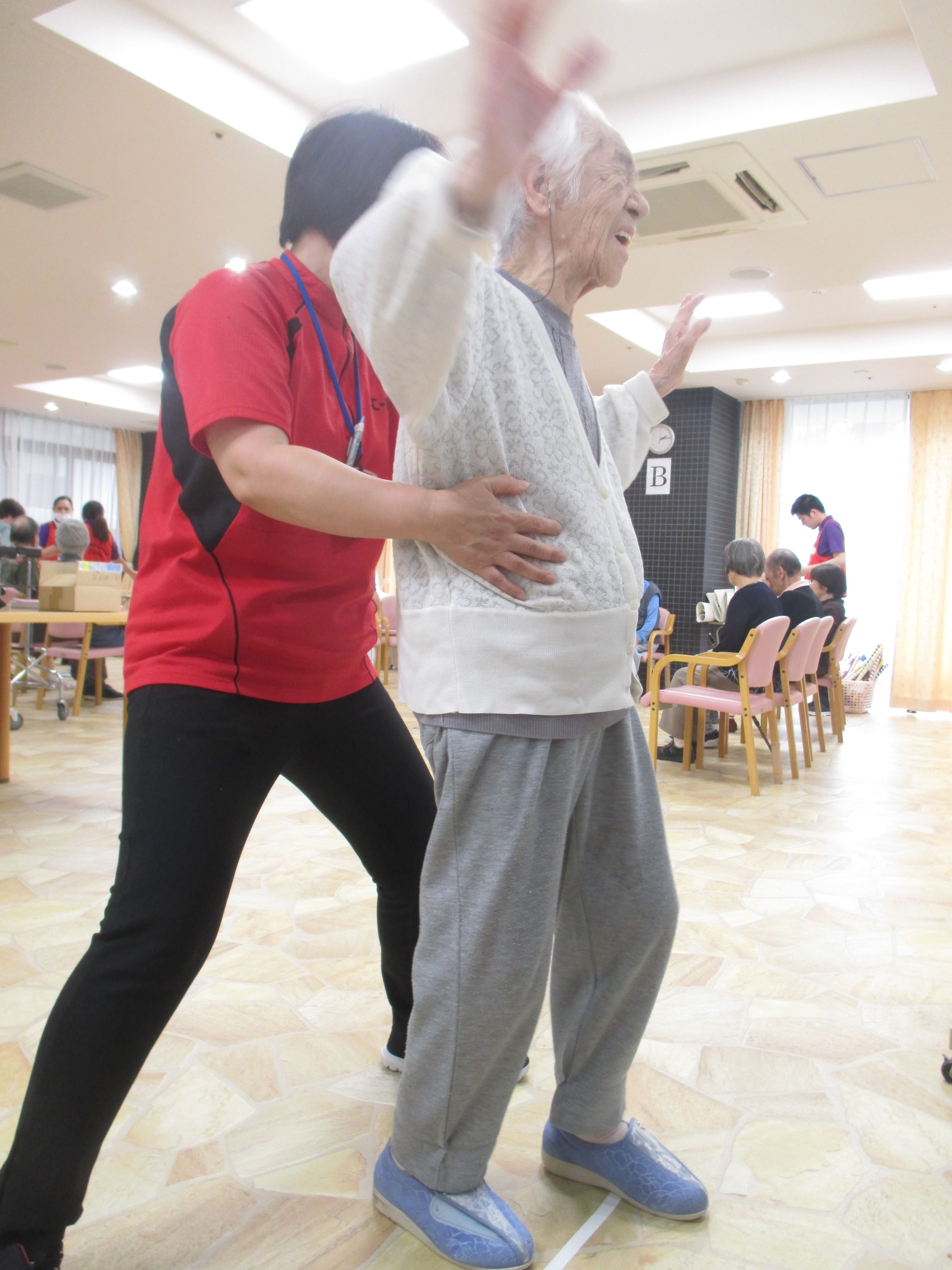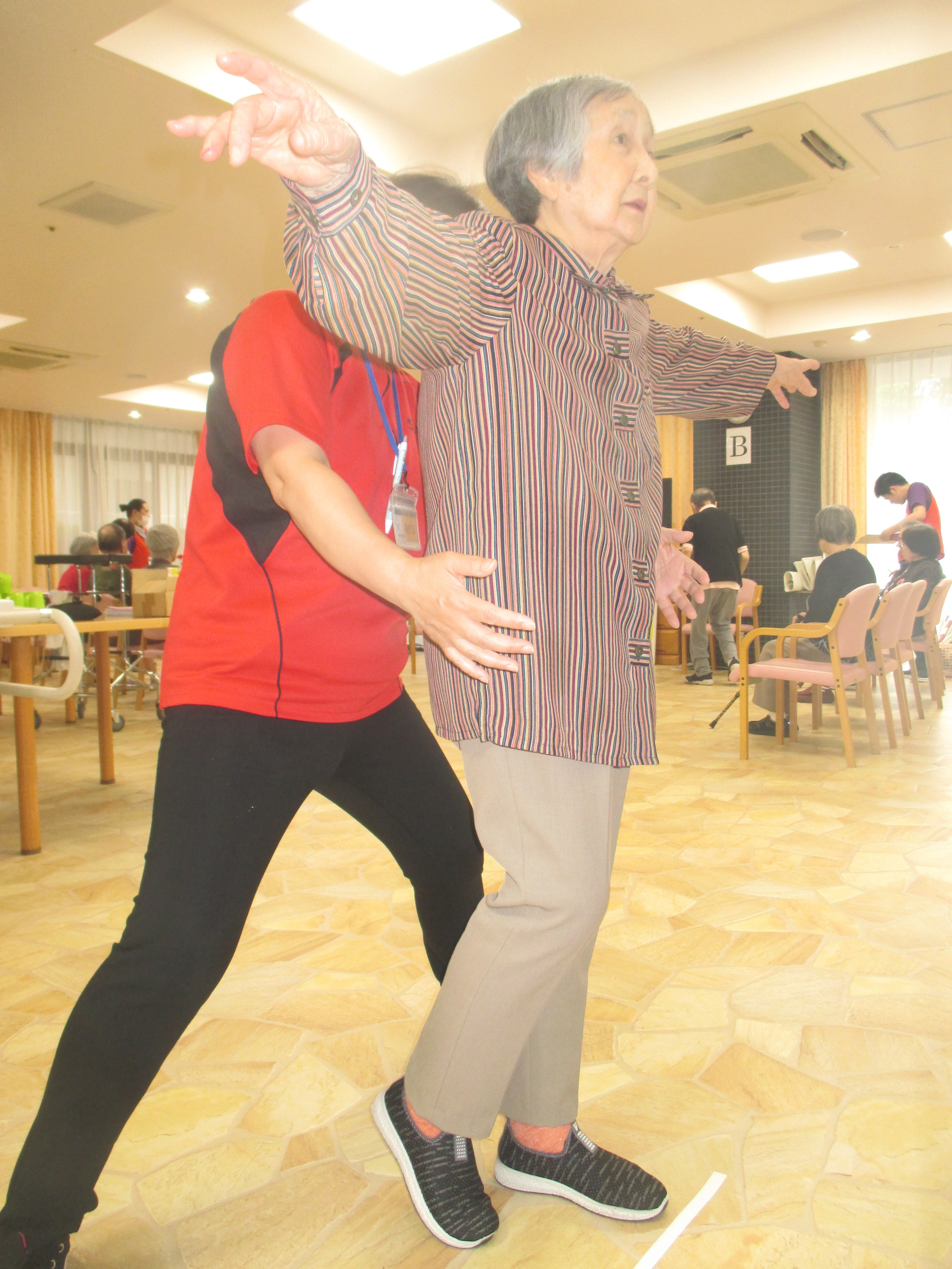 普段は笑顔のご入居者もバランスを崩さないように真剣な表情でやっておられました!