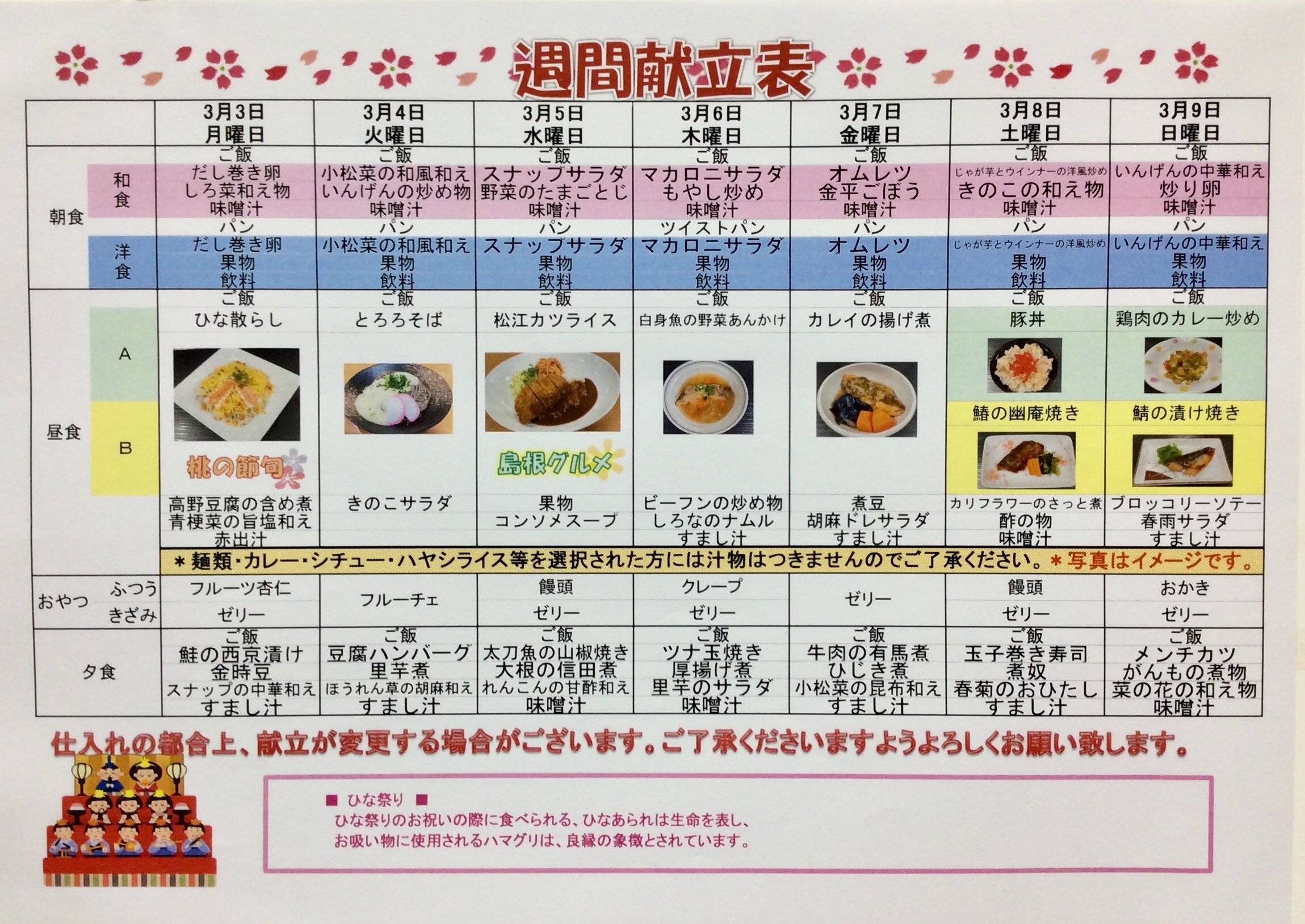 3/3~3/9の献立表をご紹介いたします。