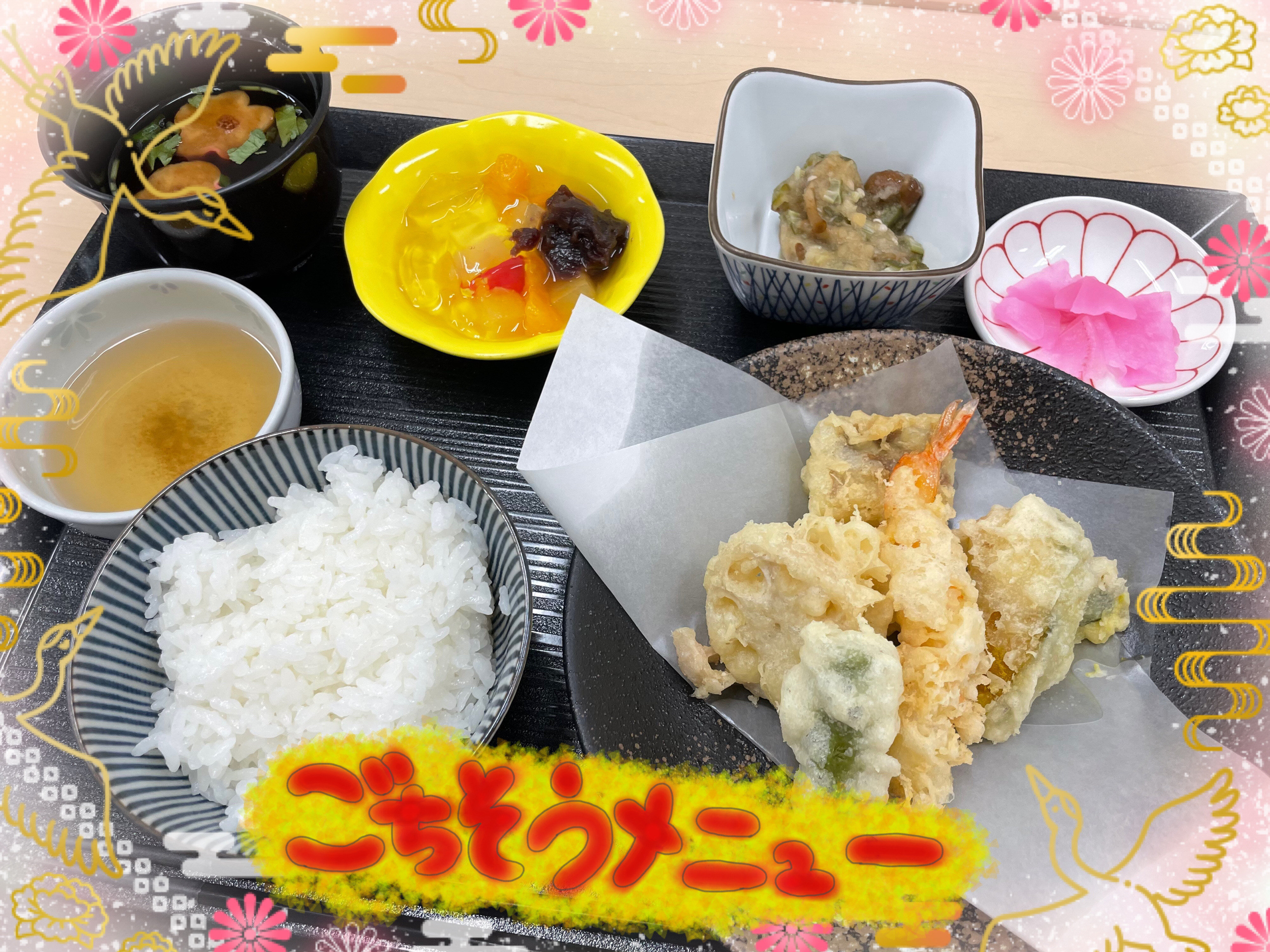 メニュー内容は "あんこうと海老の天ぷら・ご飯・みぞれ和え・赤だし・香の物・デザート" です♡