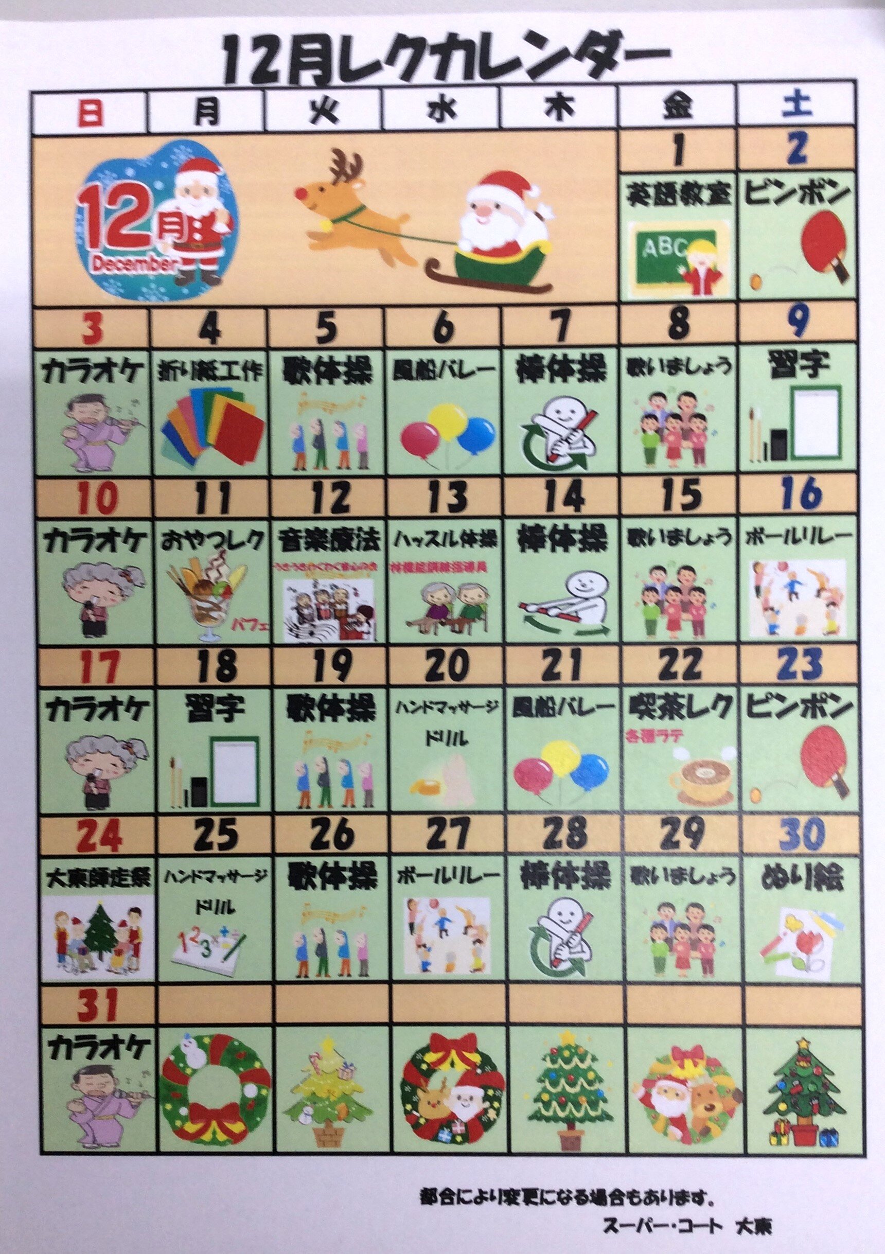 遅くなりましたが、12月のレクカレンダーをご紹介いたします。