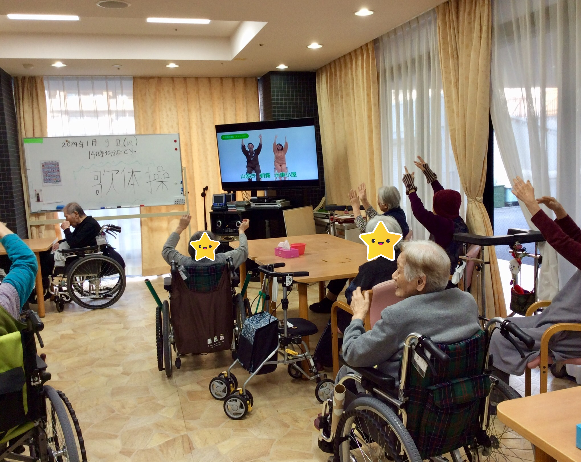 たくさんのご入居者が参加され、ビデオに合わせて体操をされていました。