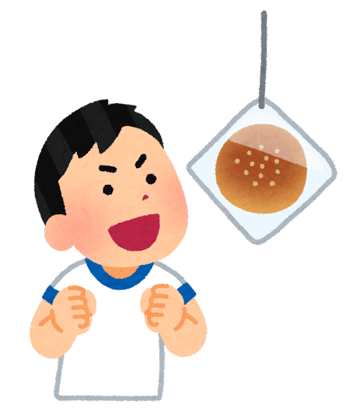 吊るされたパンを手を使わずに口で取るという意外と難関な種目になります。