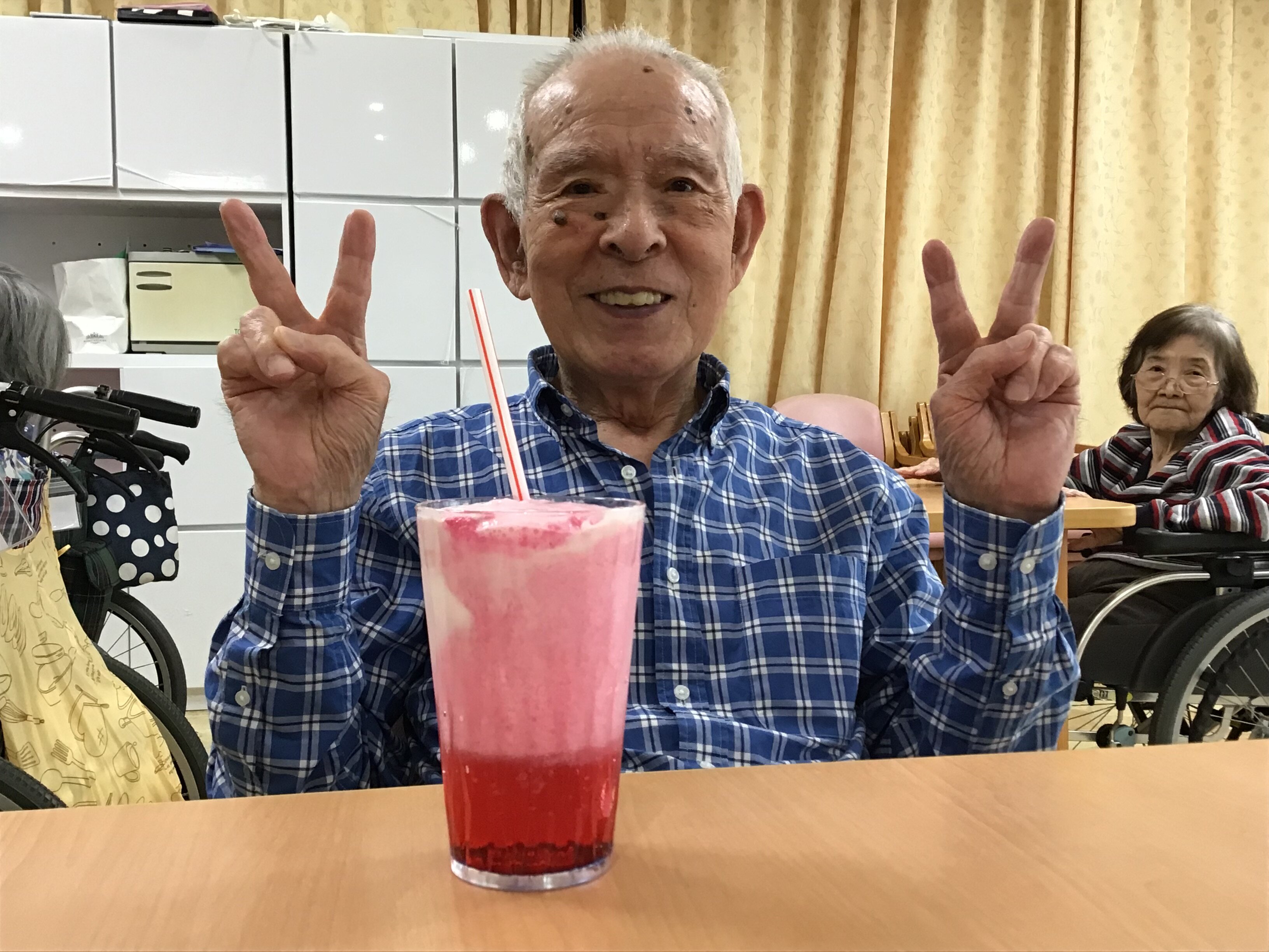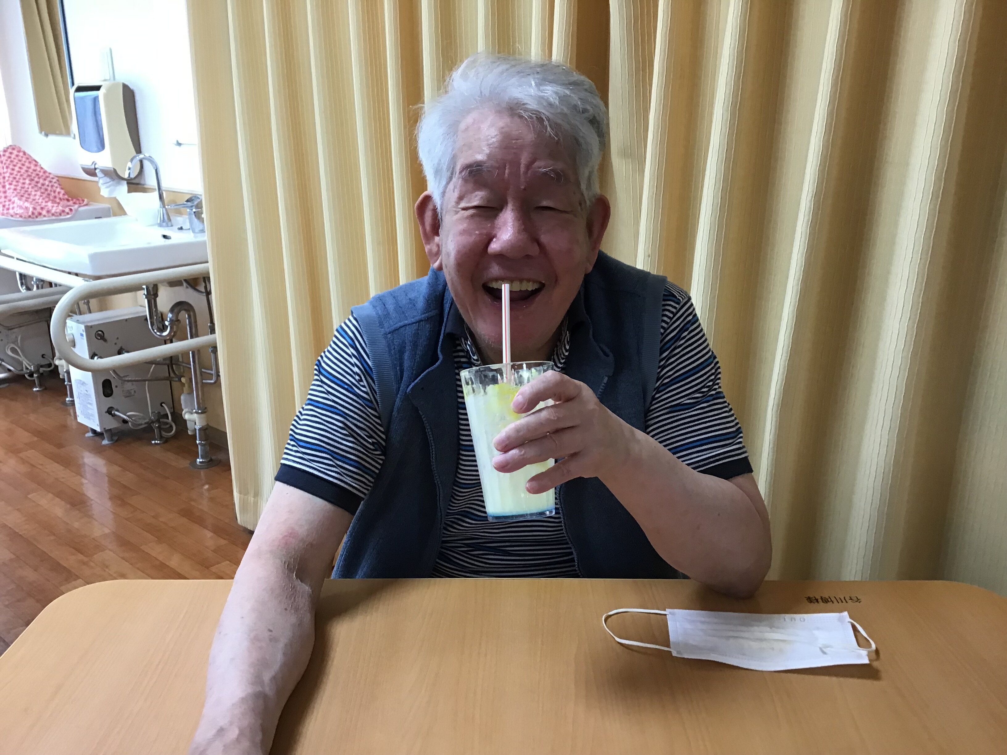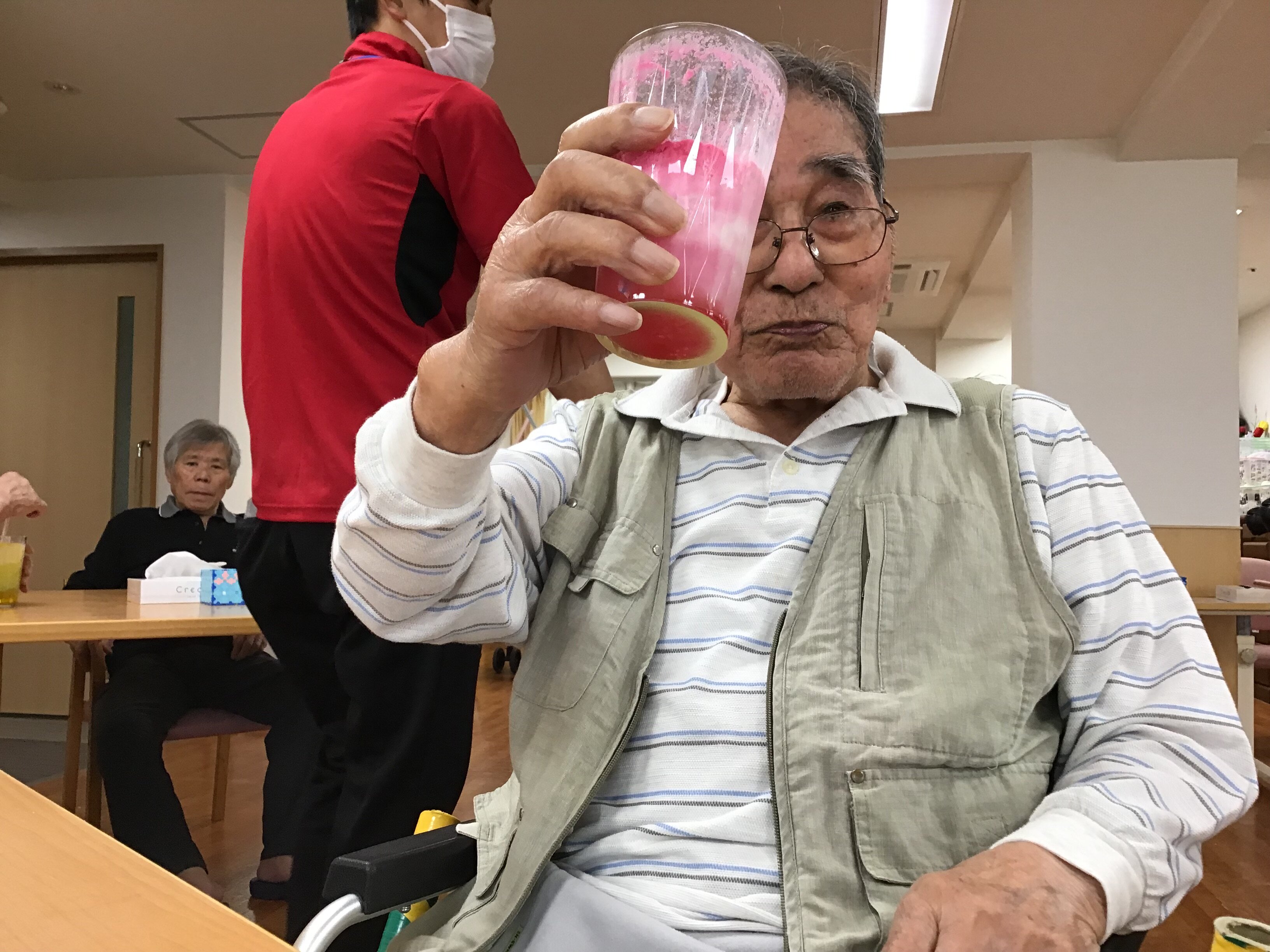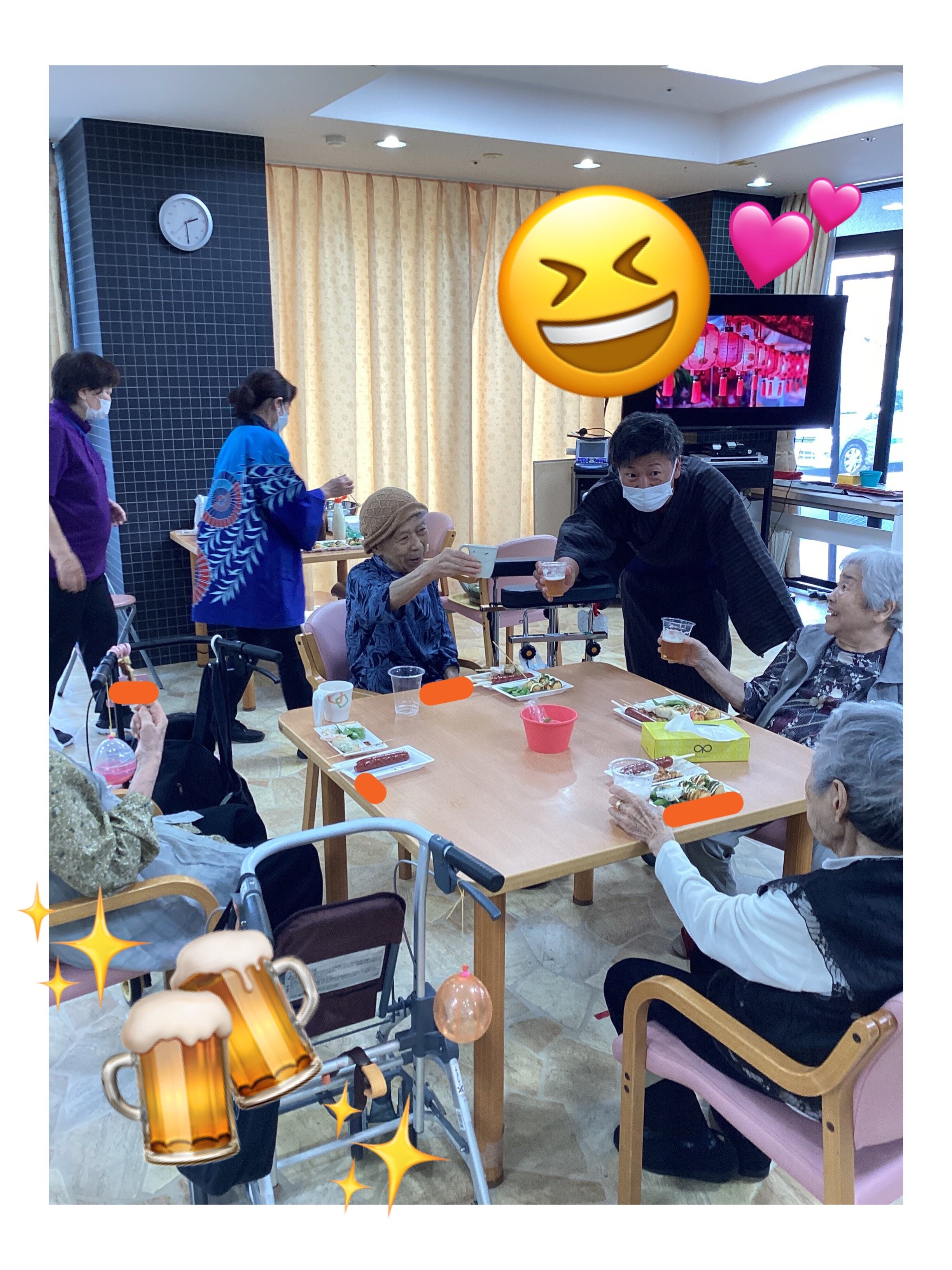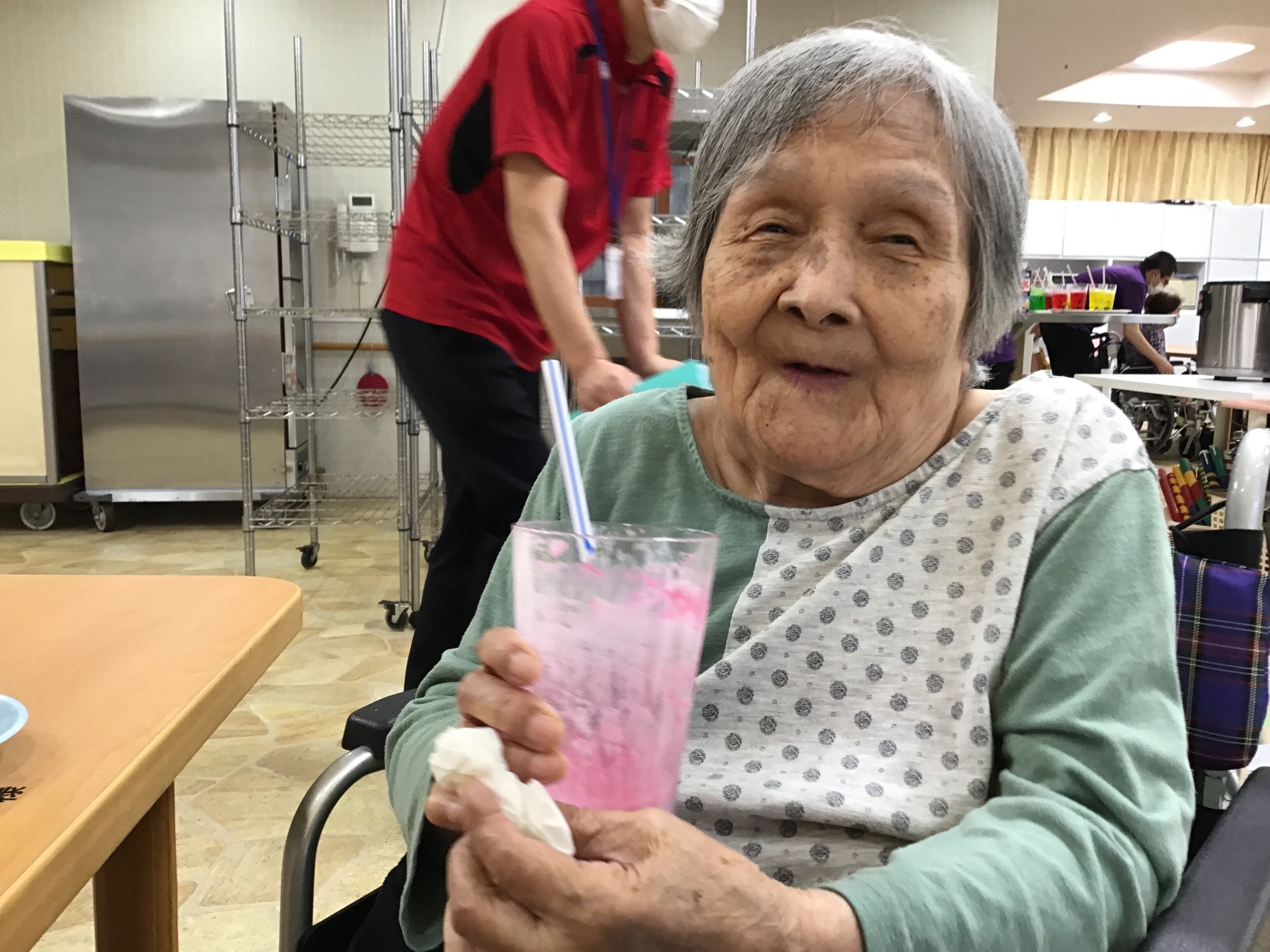 施設長が浴衣を着て皆さんに飲み物を配ってくれました!