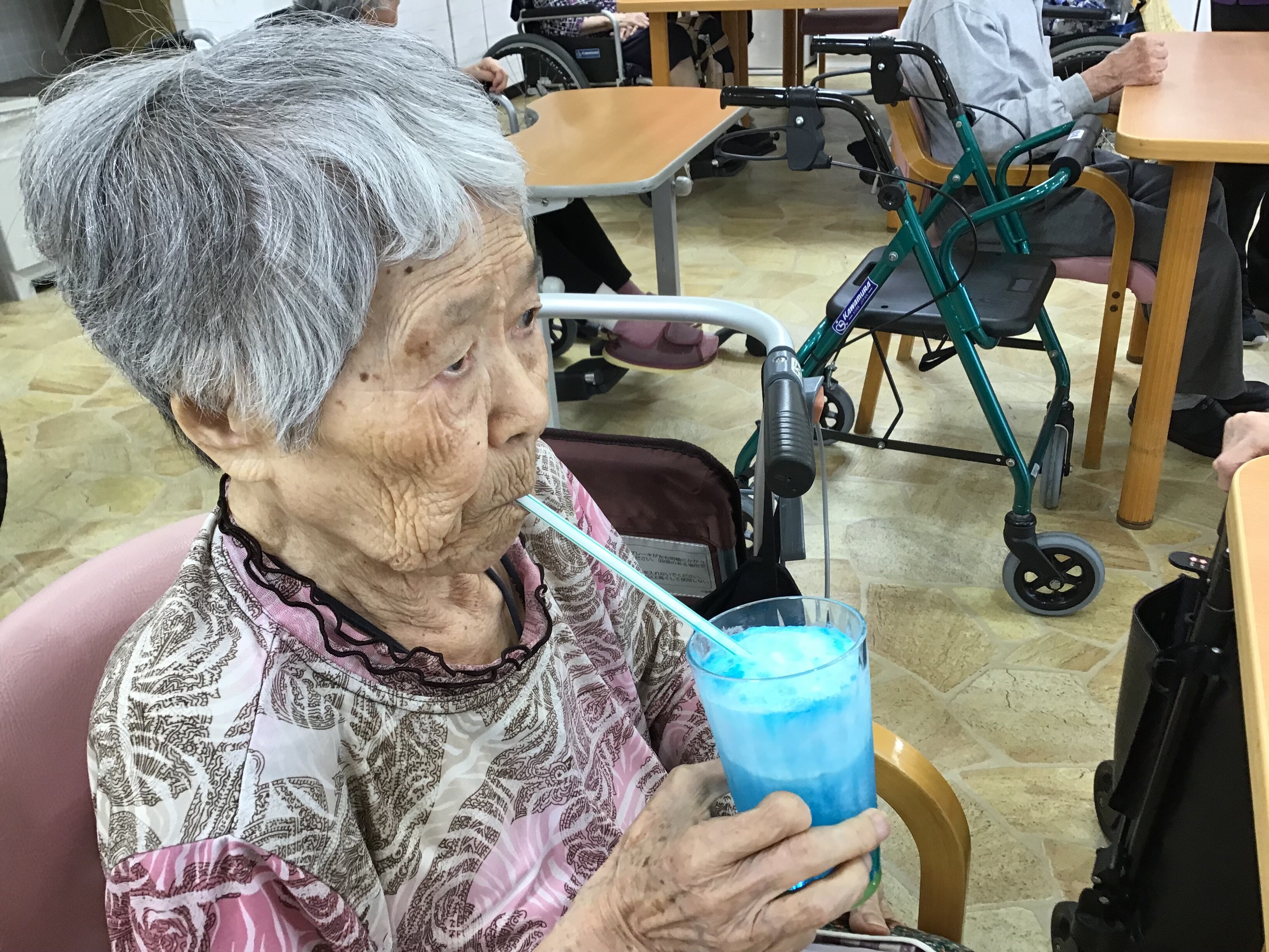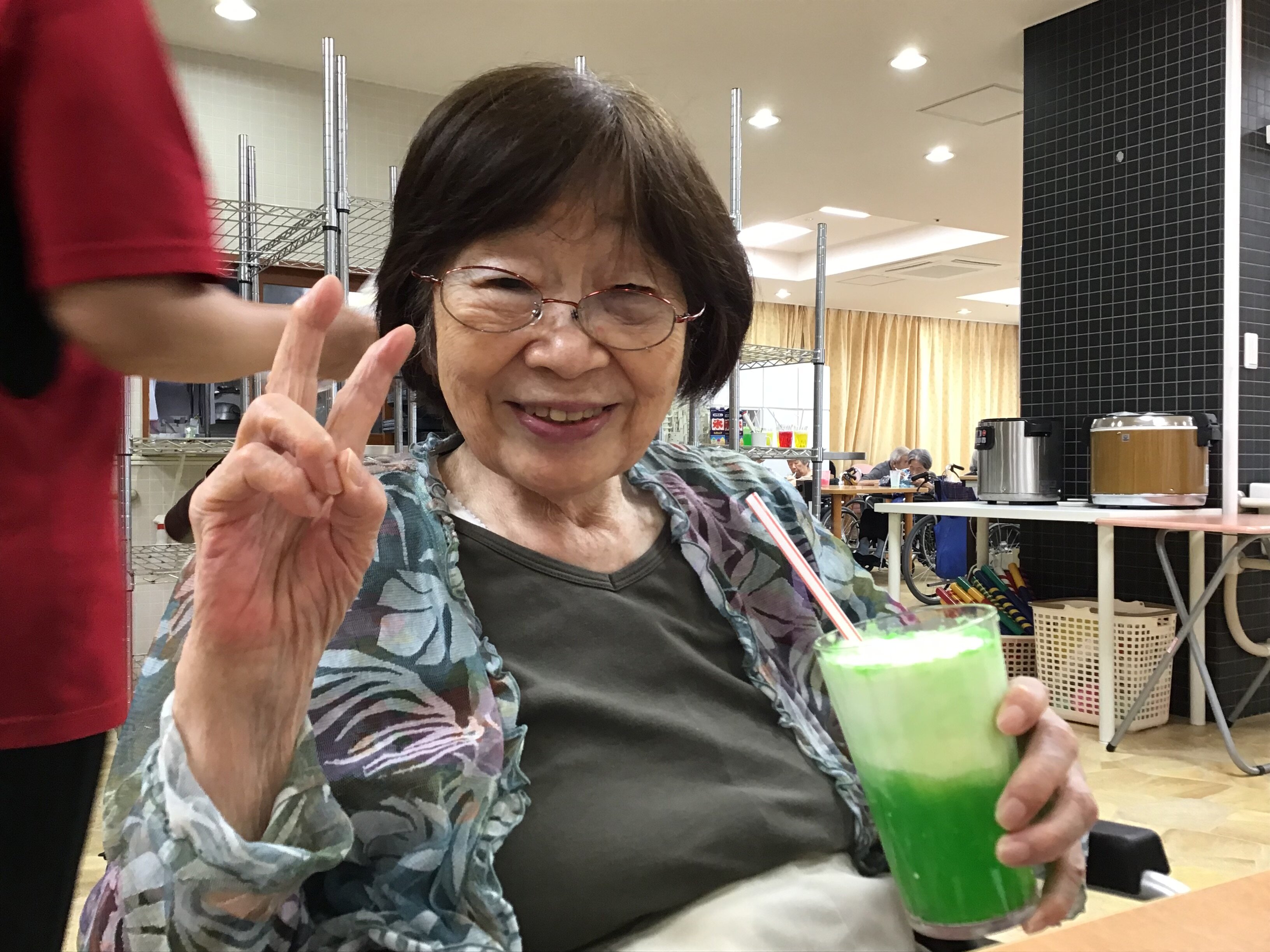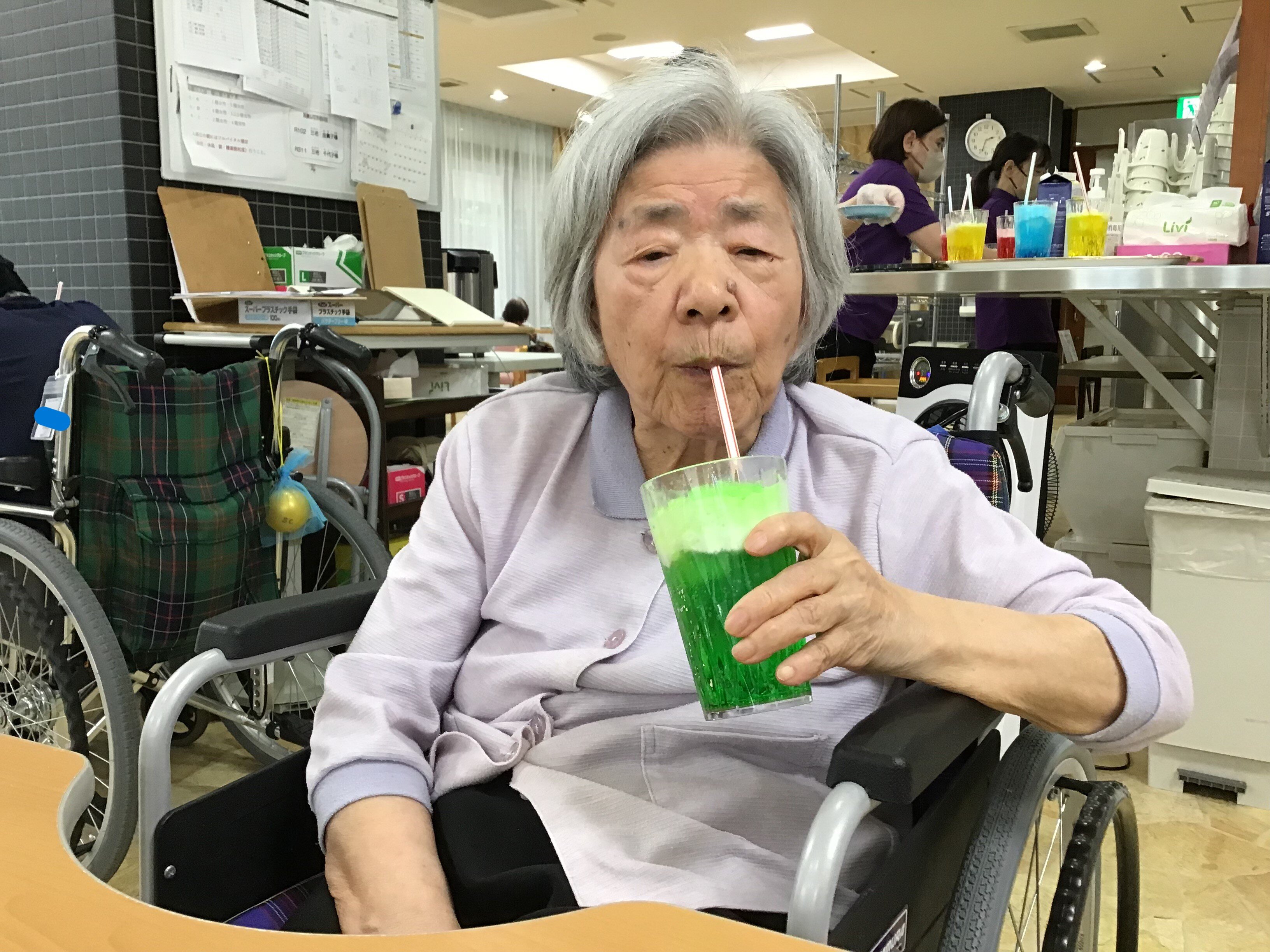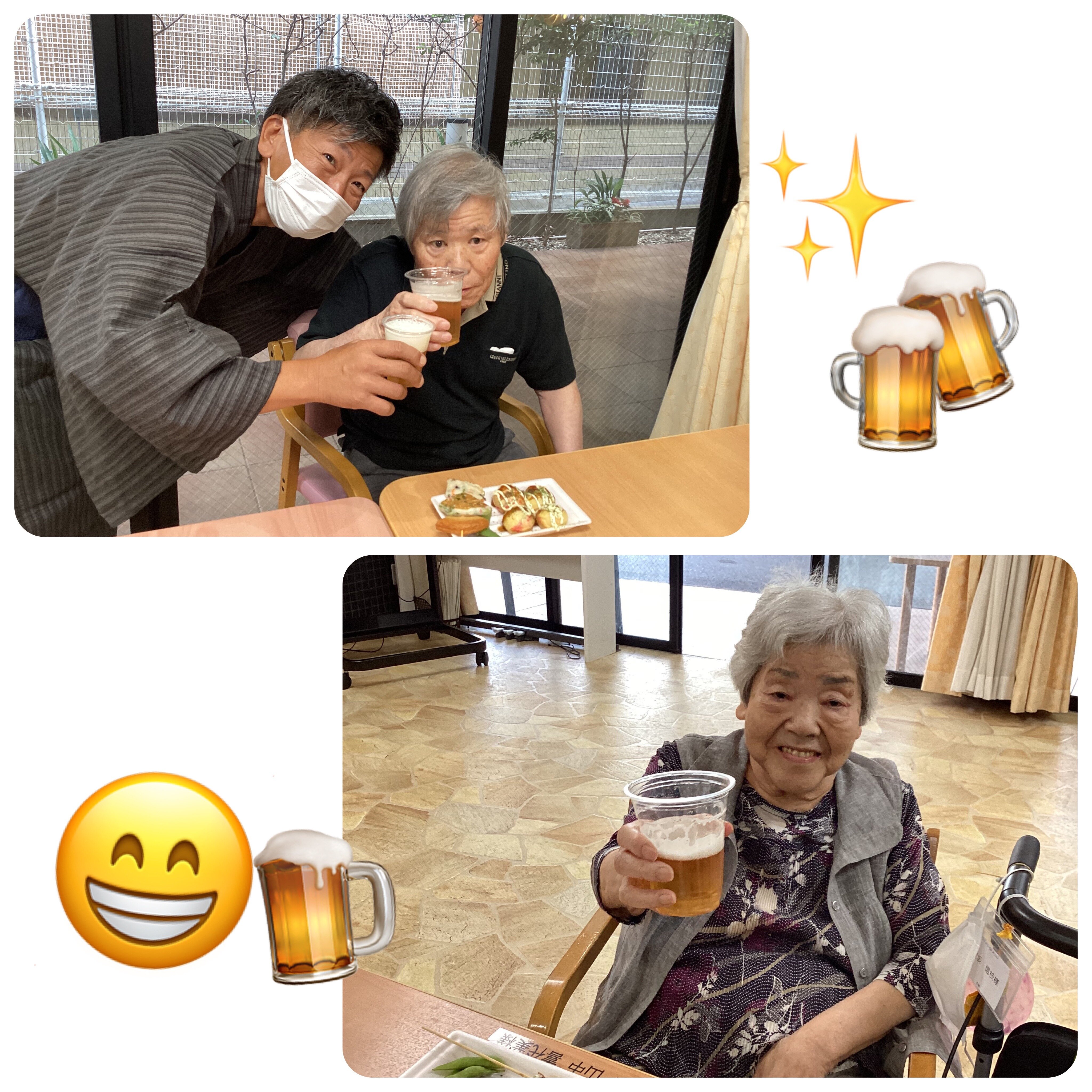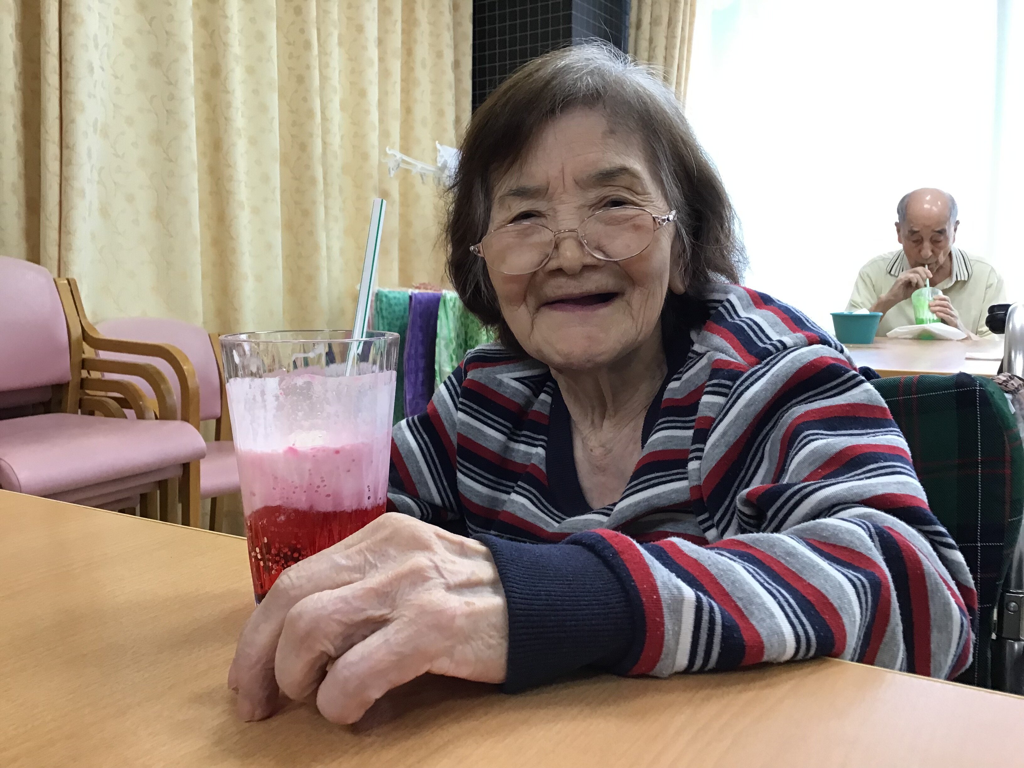 施設長が浴衣を着て皆さんに飲み物を配ってくれました!