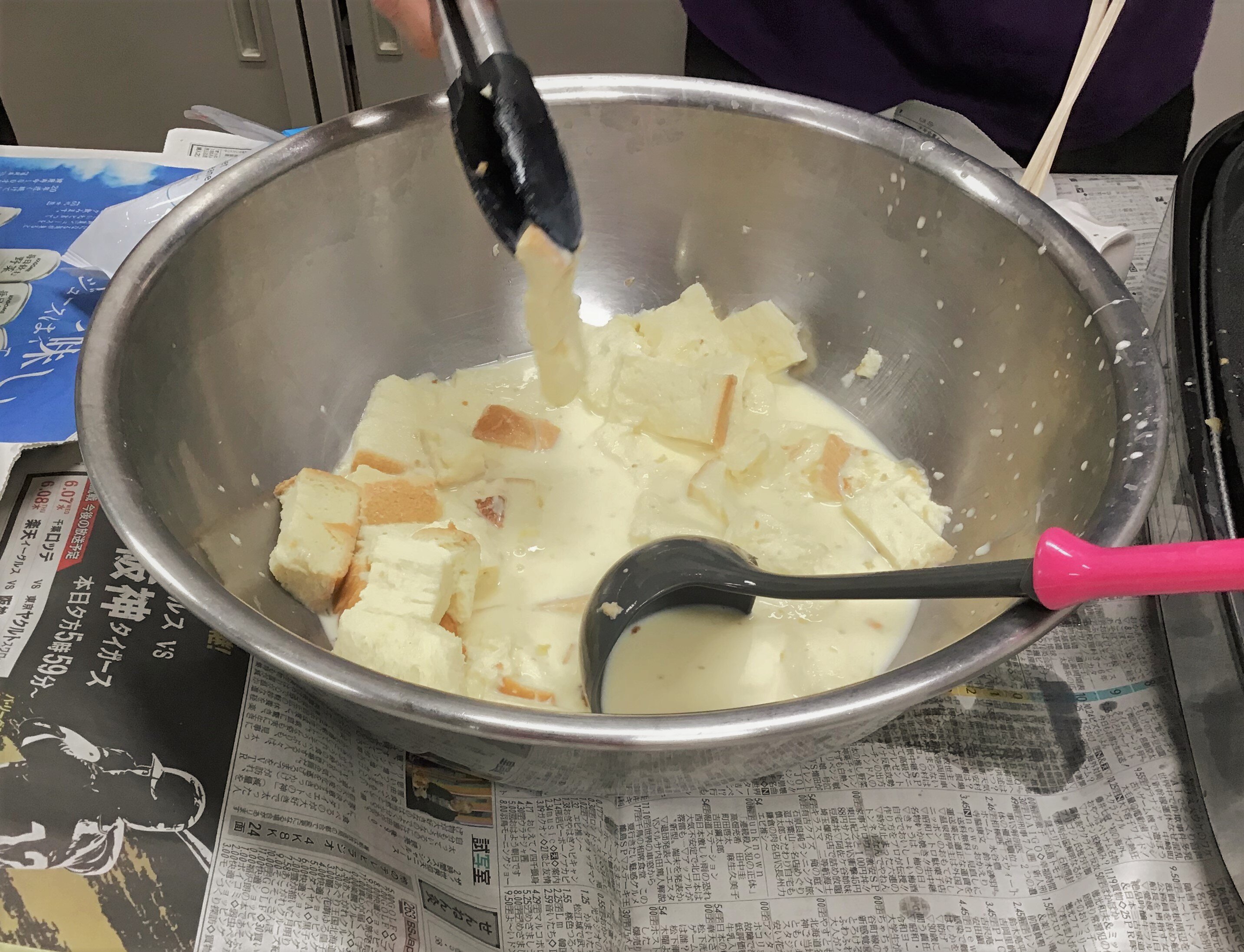 大きなボールにたっぷりの卵液と食パンを浸します❀