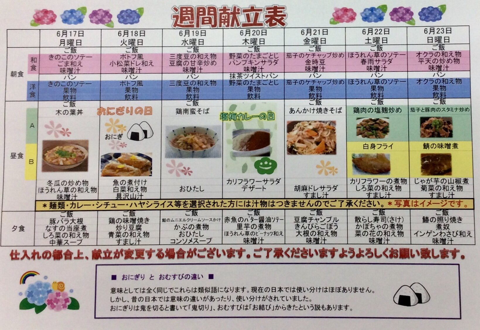 6/18の昼食は、主食を『おにぎり』で提供いたします。
