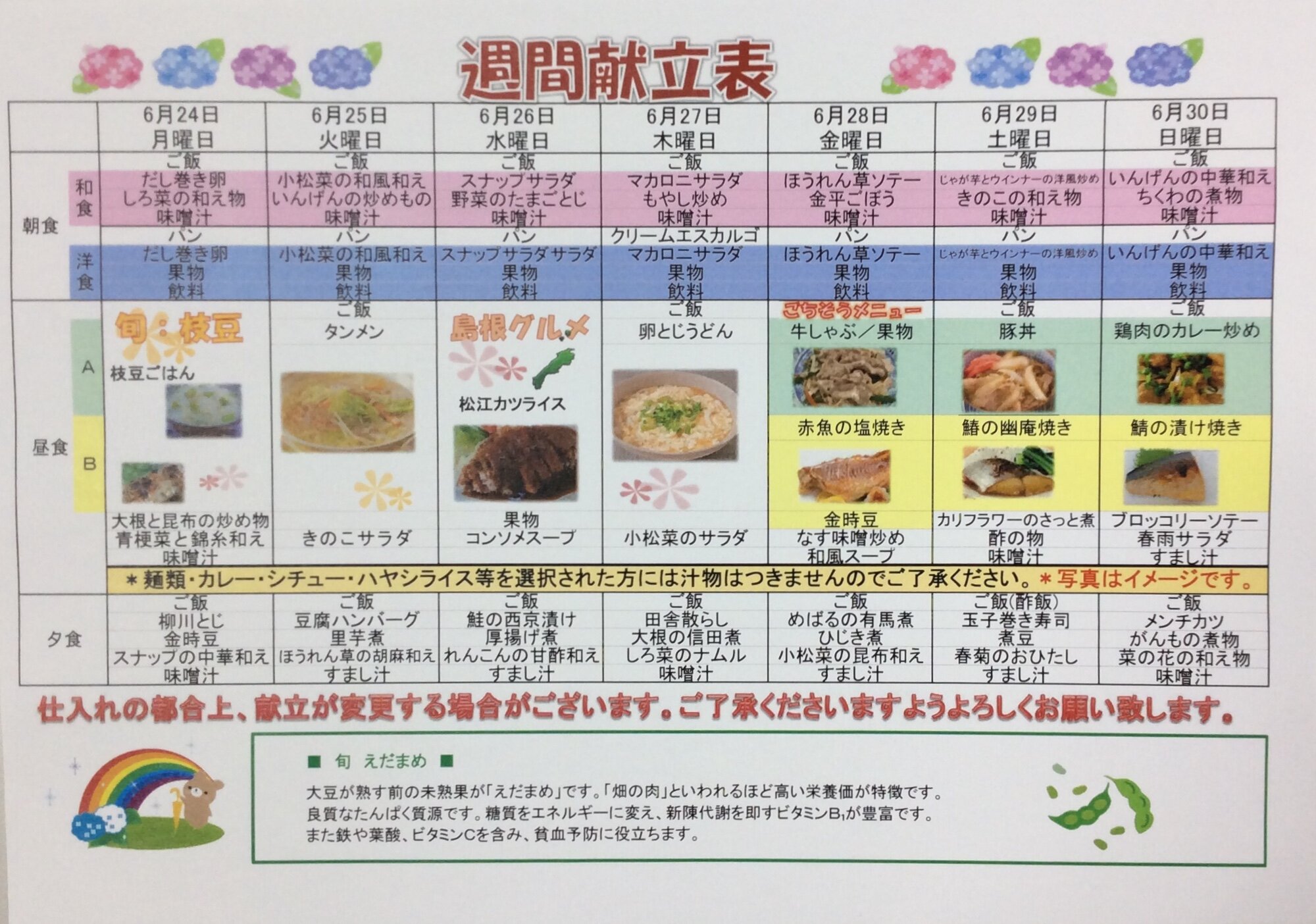 毎週恒例の、献立表をご紹介いたします。