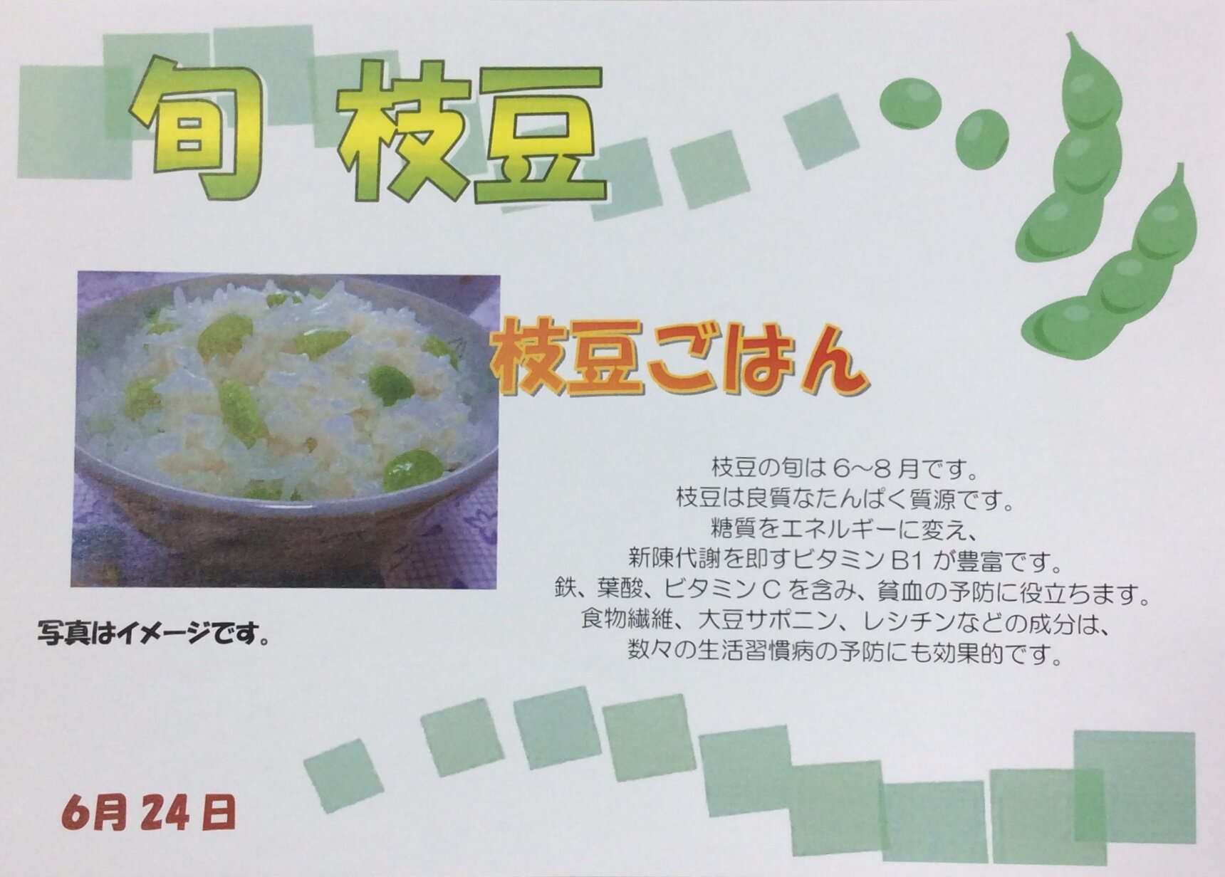 24日の昼食は、旬の枝豆を使って『枝豆ごはん』です。