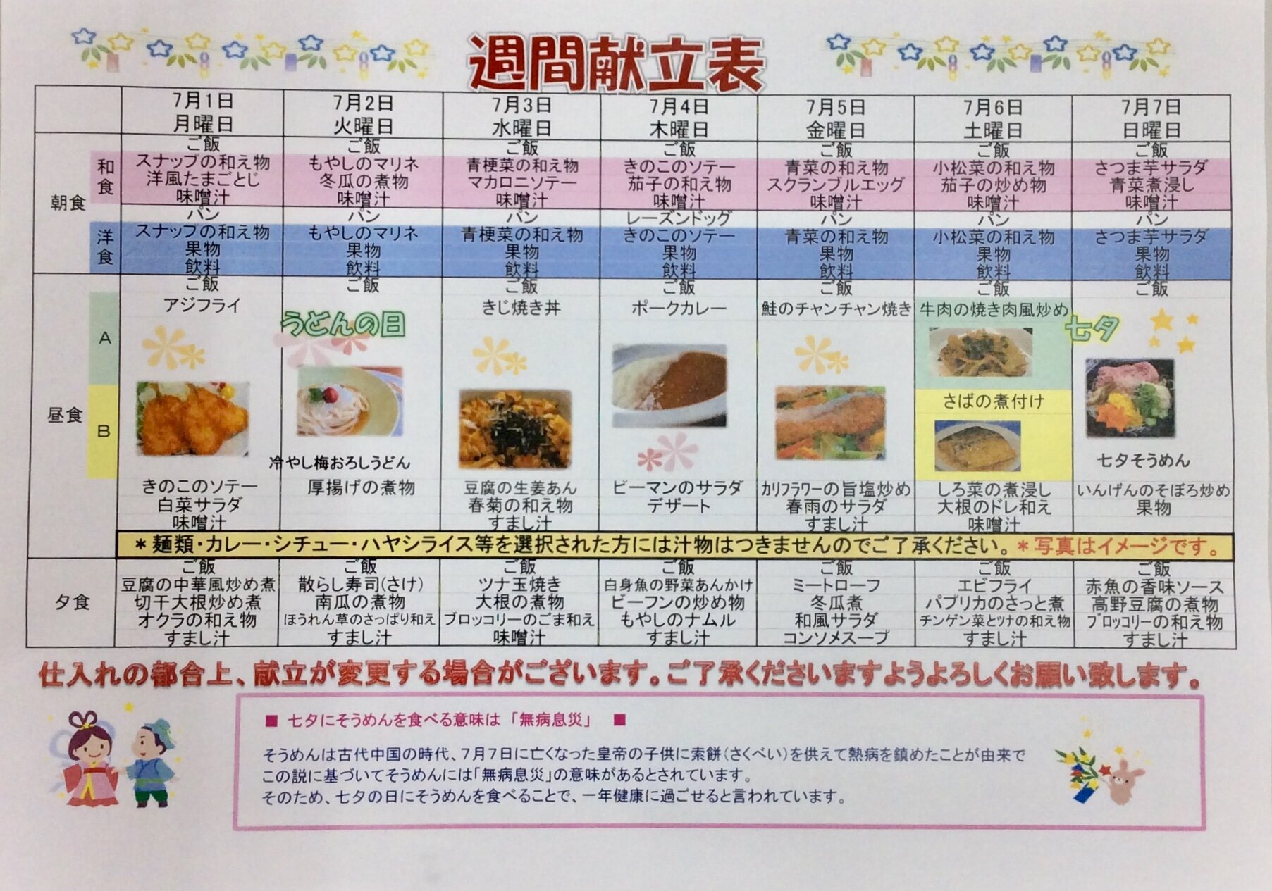 今回は、7/1~7/7の献立表をご紹介いたします。