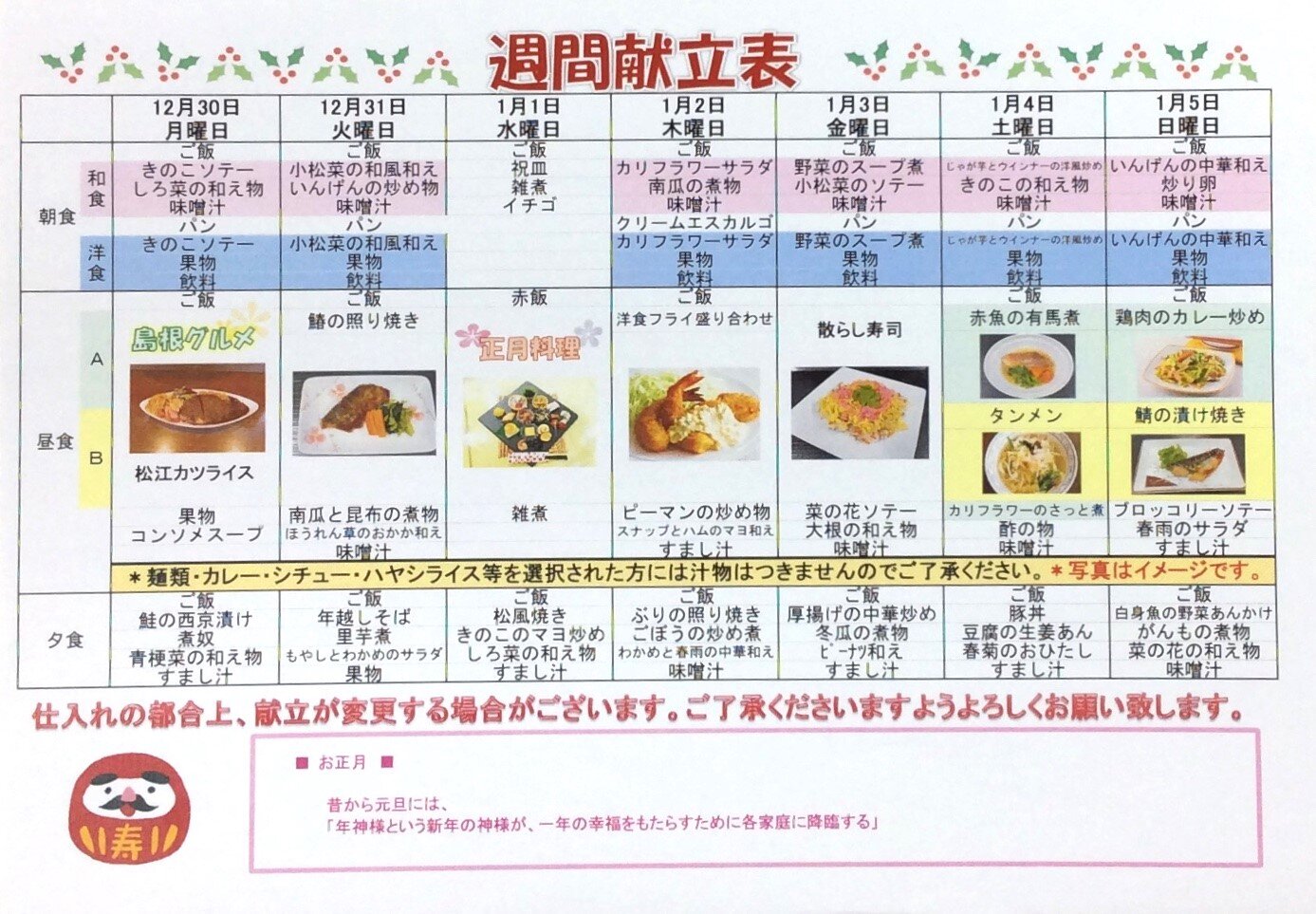 12/30~1/5の献立表をご紹介いたします。