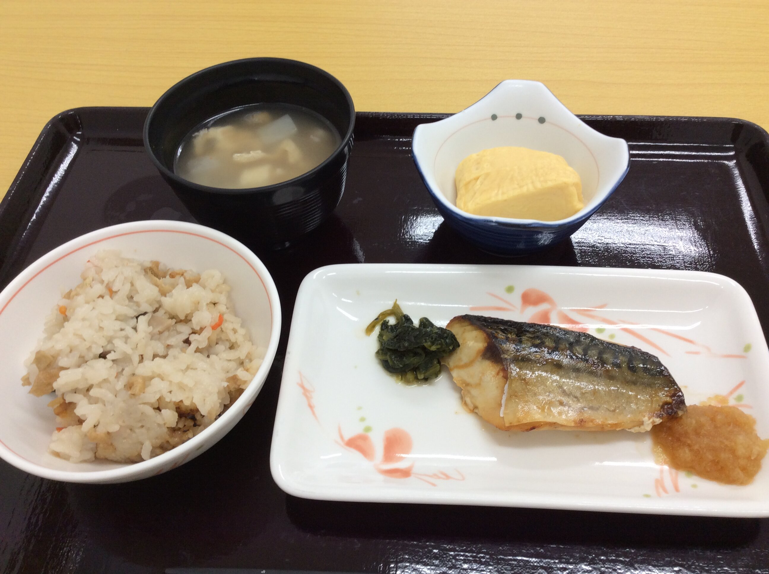 今日の昼食は『焼き鯖定食』 内容は、焼き鯖、かやくご飯、だし巻き卵、けんちん汁です。