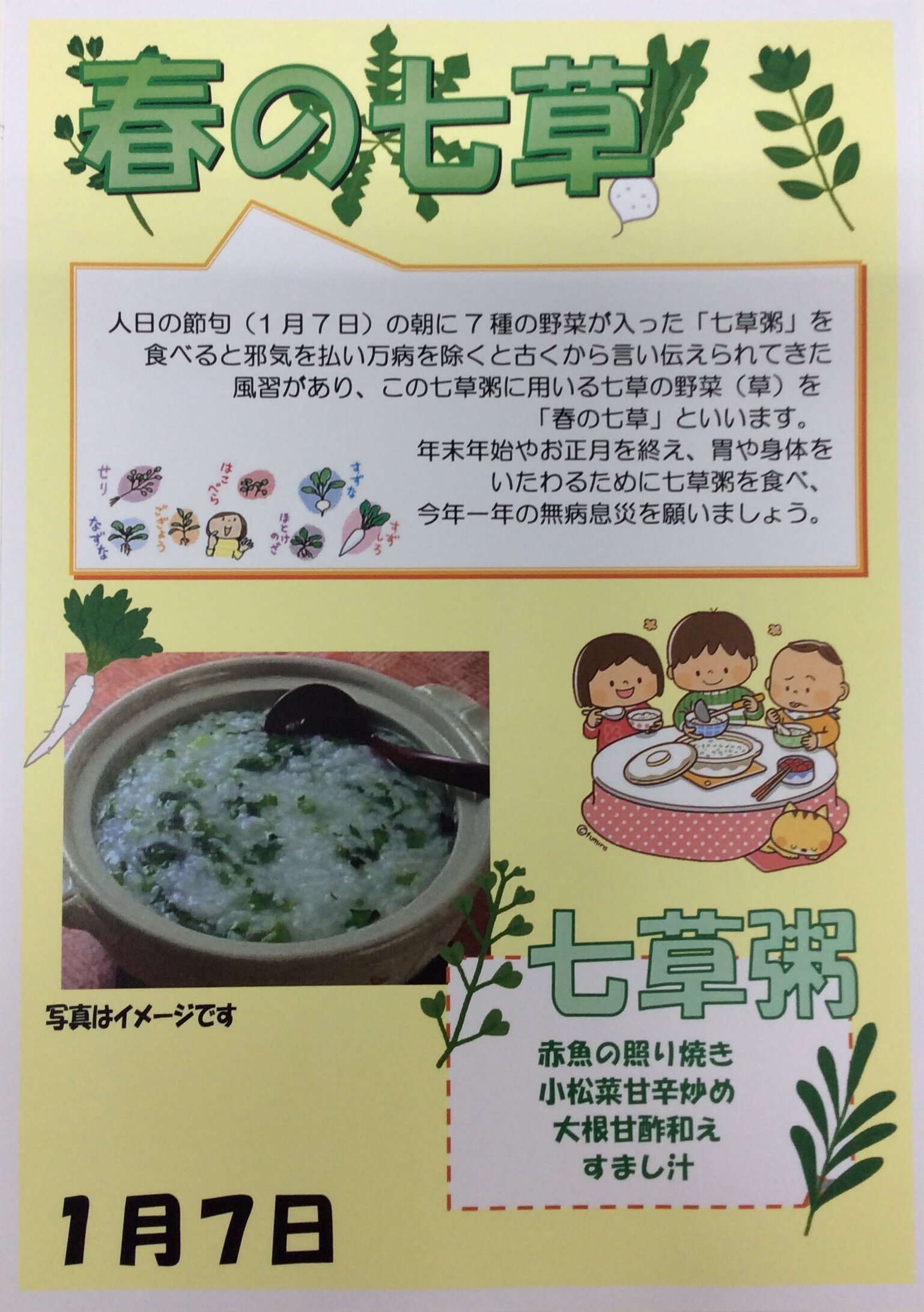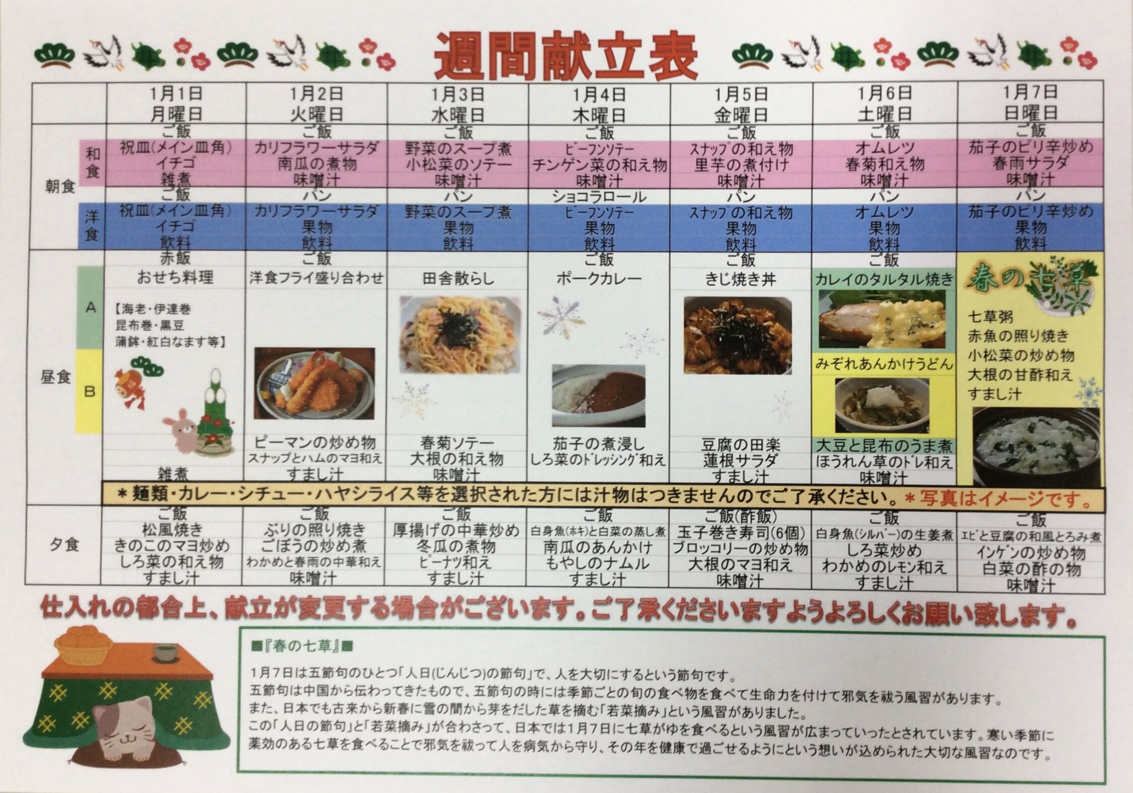 元旦は『おせち料理』、7日は『七草粥』と、お正月らしい献立となっています。