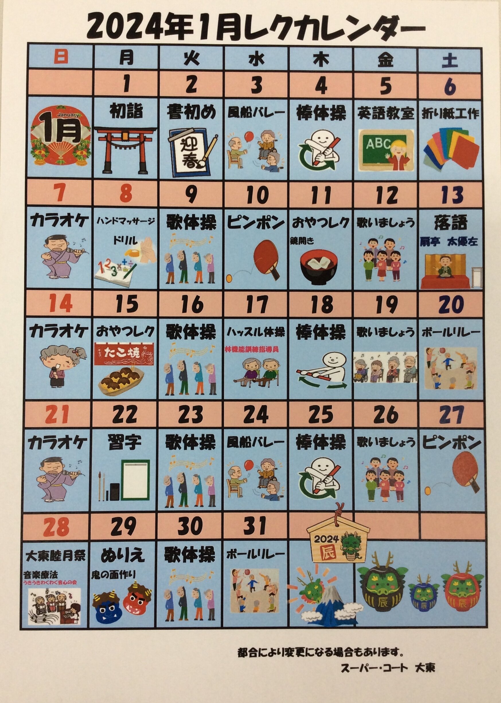 1月度レクカレンダーと、本日の昼食をご紹介いたします。